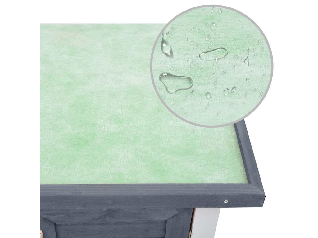 Králikáreň má rám z vysokokvalitného dreva, takže je skutočne pevná, bezpečná a vydrží vám celé roky. Zelená strieška zvieratá ochráni pred dažďom a pohodlný koterec poskytuje príjemné miesto na spanie. Vďaka dvom vyťahovacím dnám sa klietka dá bez problémov vyčistiť. Dvierka sa ľahko zatvárajú a dajú sa uzamknúť zasunutím západky.