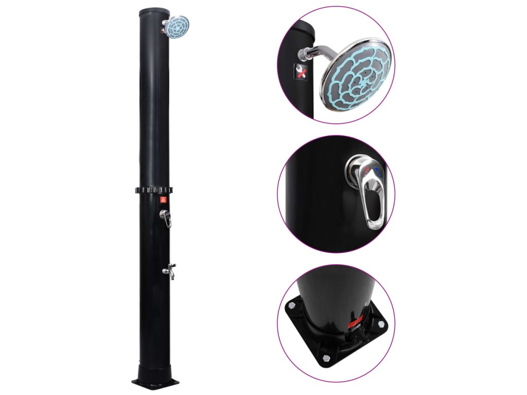 Súčasťou je aj kohútik, aby sprcha vyhovovala aj iným potrebám. Pribalili sme aj 4 skrutky, aby ste mohli základňu sprchy pevne a stabilne namontovať na rovný pevný povrch. Vďaka elegantnému a efektnému vzhľadu táto solárna sprcha skvele doplní vašu záhradu alebo bazén.