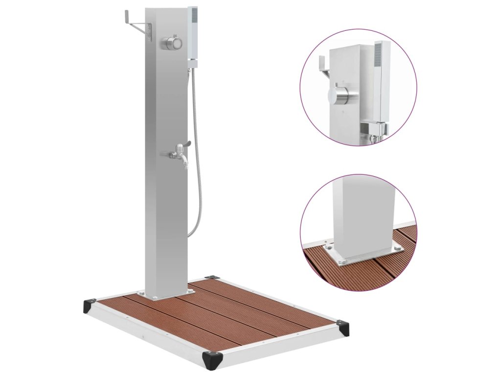 Táto záhradná sprcha má štýlový dizajn a v kombinácii s elegantnou sprchovou vaničkou predstavuje skvelý doplnok k bazénu, aj do iných vonkajších priestorov.