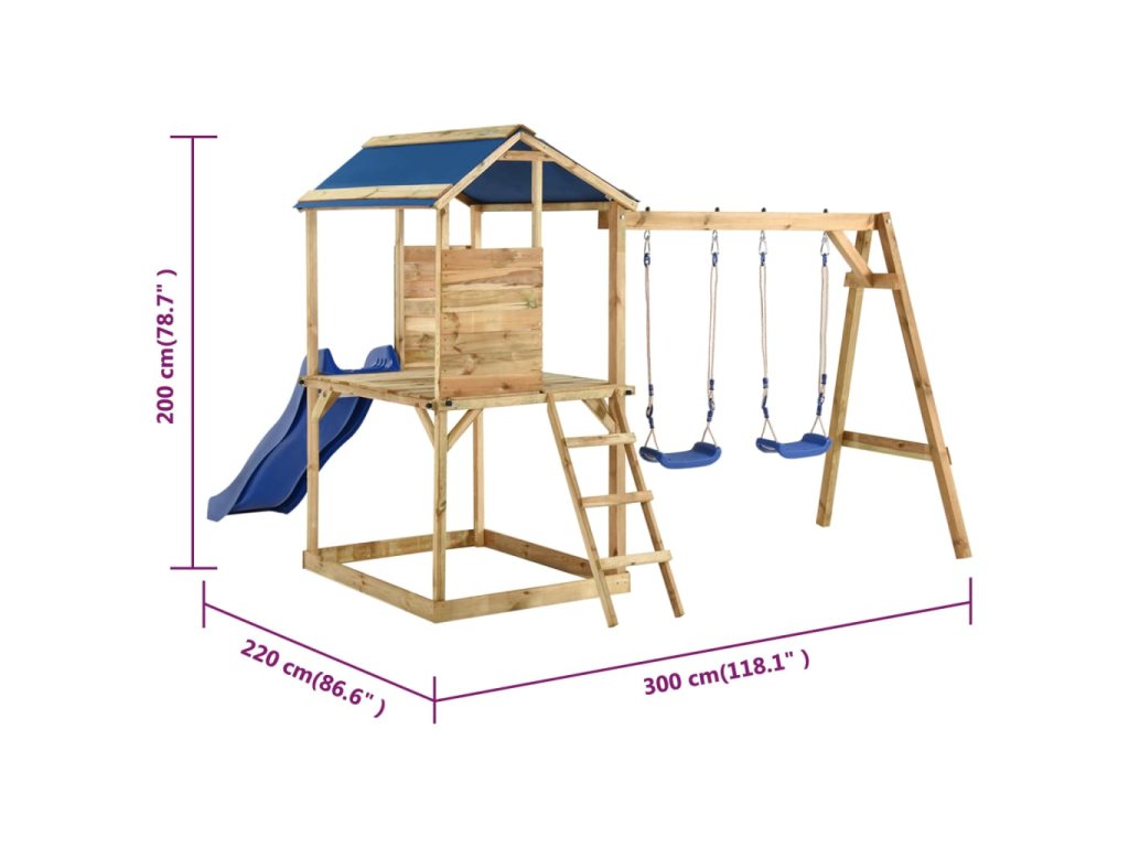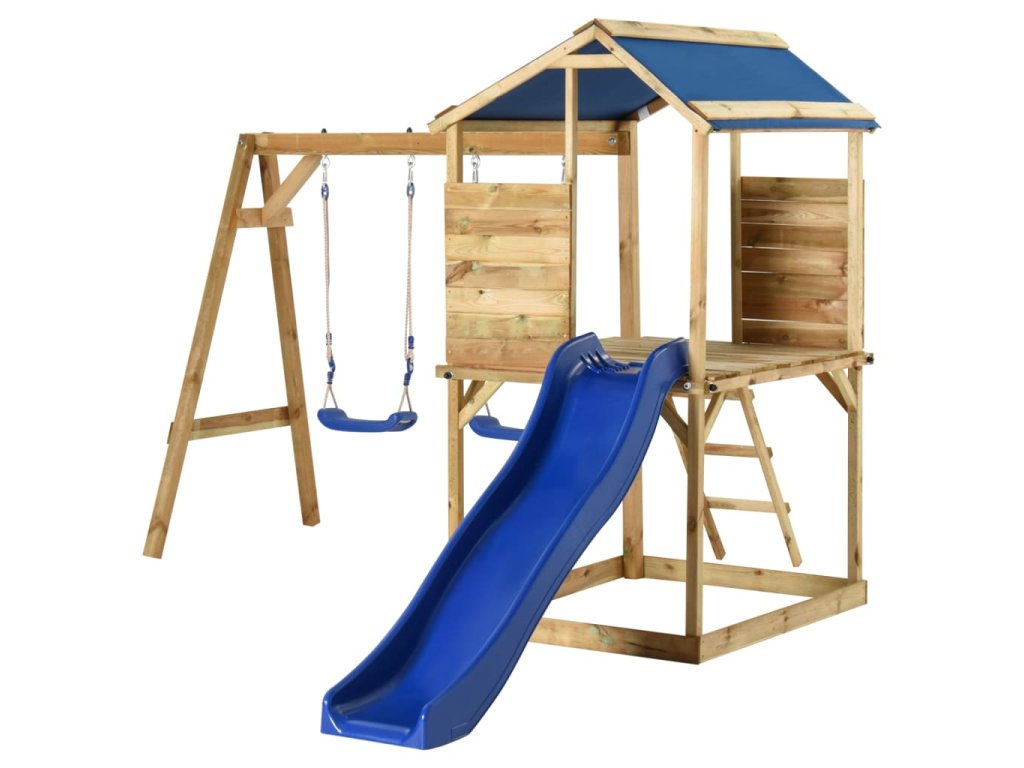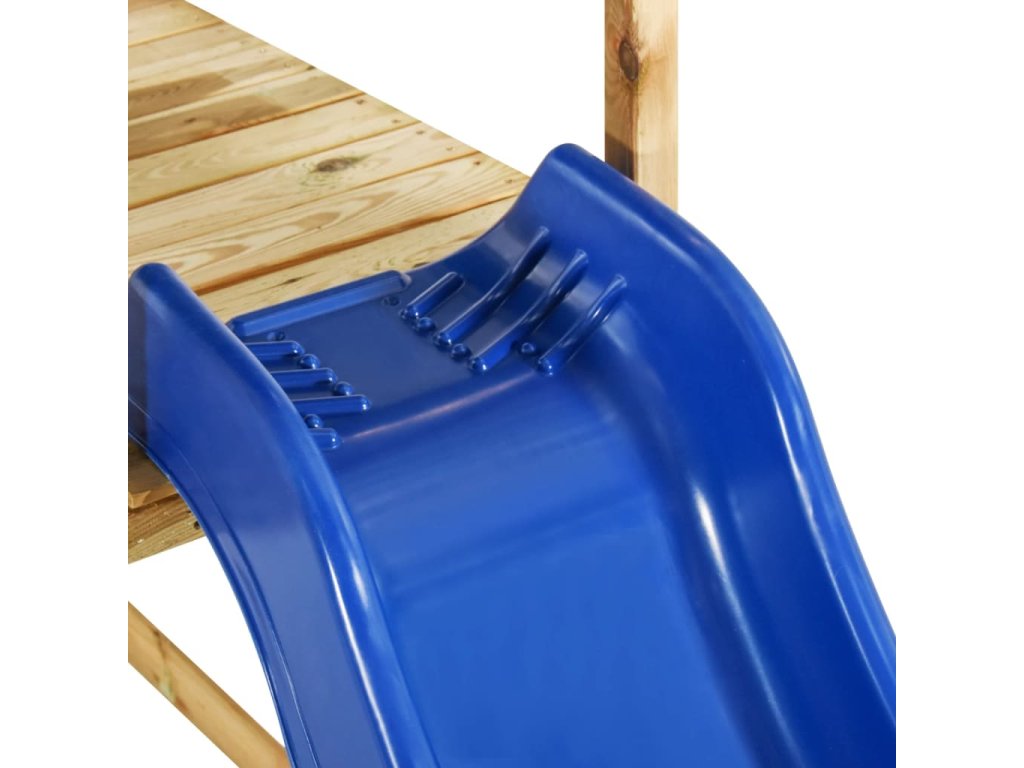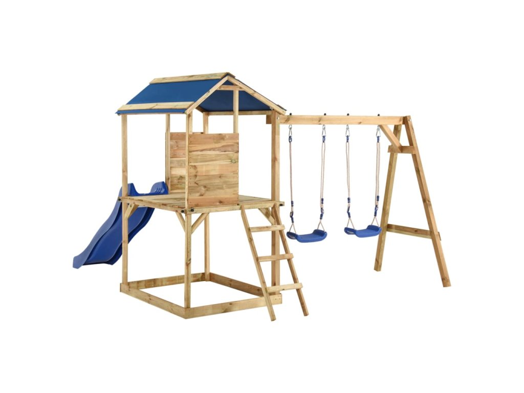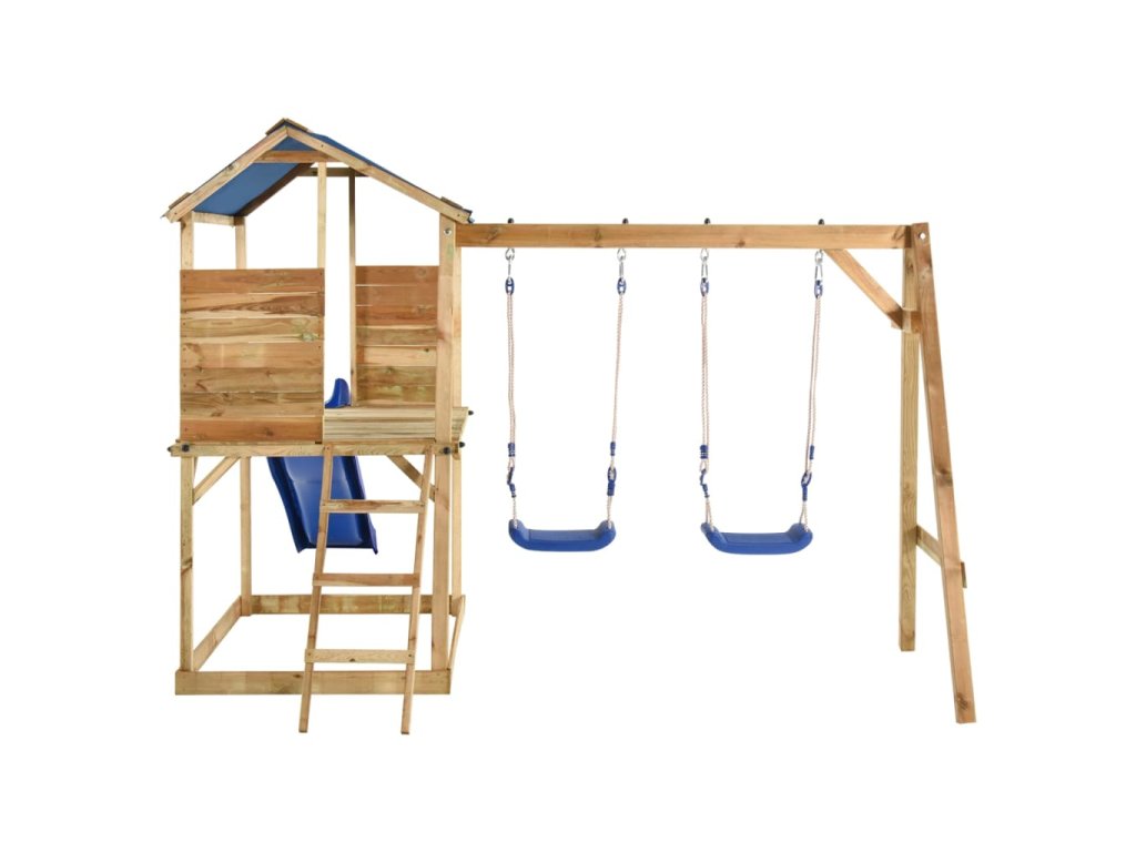 Robustný rám je vyrobený z impregnovaného borovicového dreva, vďaka čomu je stabilný a odolný voči hnilobe. Hojdačky sú k rámu pripevnené pomocou kovových háčikov a farebné držadlá zaisťujú väčšiu bezpečnosť. Rodičia tak môžu byť pokojní, keď sa ich deti hrajú na hracej súprave vyrobenej podľa najnovších bezpečnostných noriem. Hracia súprava obsahuje pevný drevený rám, dve hojdačky, rebrík na šplhanie a šmýkačku. Vďaka všetkým týmto prvkom možno túto kompletnú hraciu súpravu používať na lezenie, plazenie a schovávanie. Vaše ratolesti môžu k zábave prizvať aj svojich kamarátov.