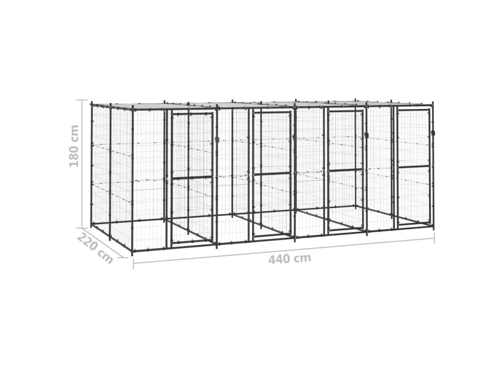 Táto psia búda poskytuje dostatok priestoru na cvičenie. Pletivo po celom obvode pomáha predchádzať nepleche a neočakávaným nehodám a zároveň umožňuje vetranie. Vďaka pevnej oceľovej konštrukcii s práškovým nástrekom je táto psia búda odolná a vyrobená tak, aby vydržala. Vyrobená z PE, priložená vrchná strieška je vodeodolná a odolná voči UV žiareniu. Dvere s pántmi a uzamykateľným západkovým systémom zaisťujú extra bezpečnosť a ochranu vašich psov.