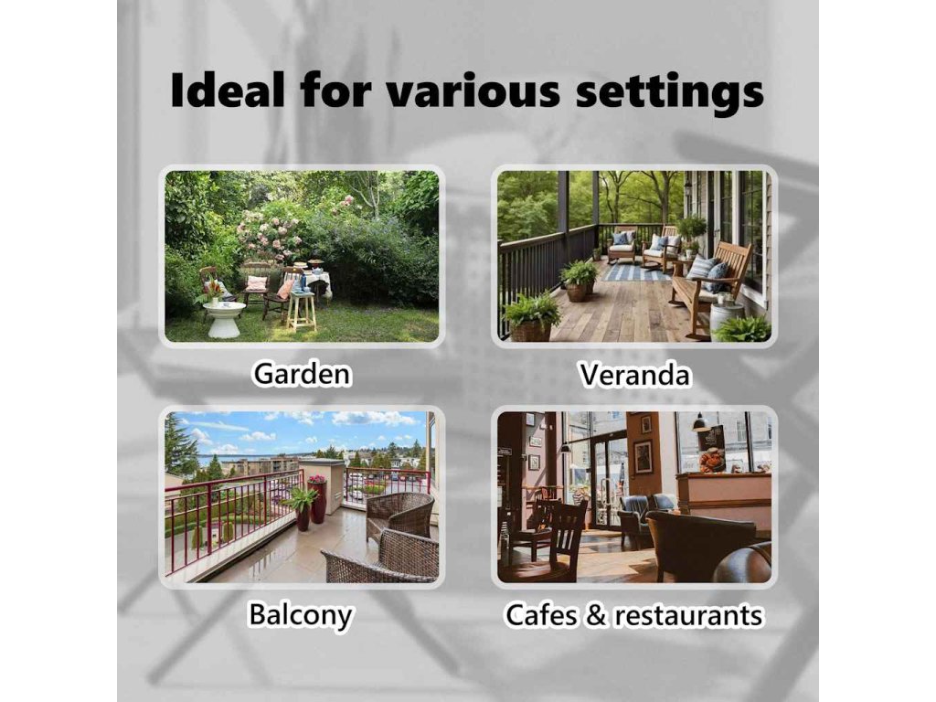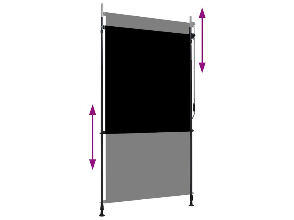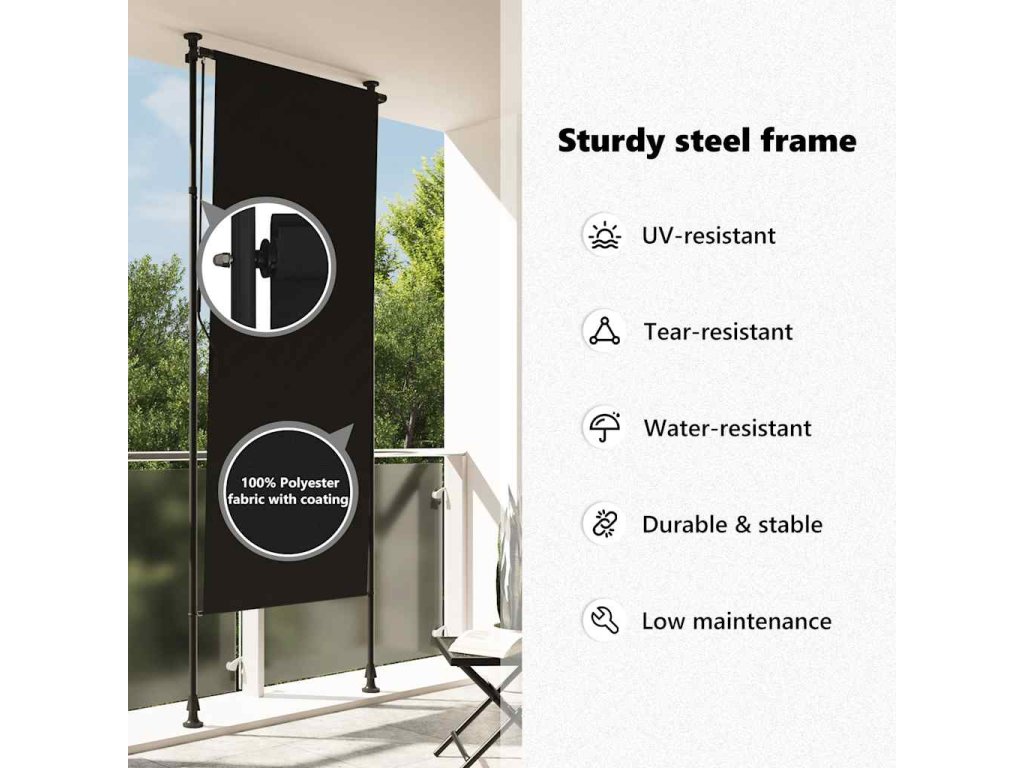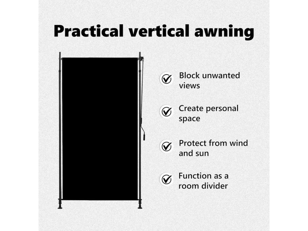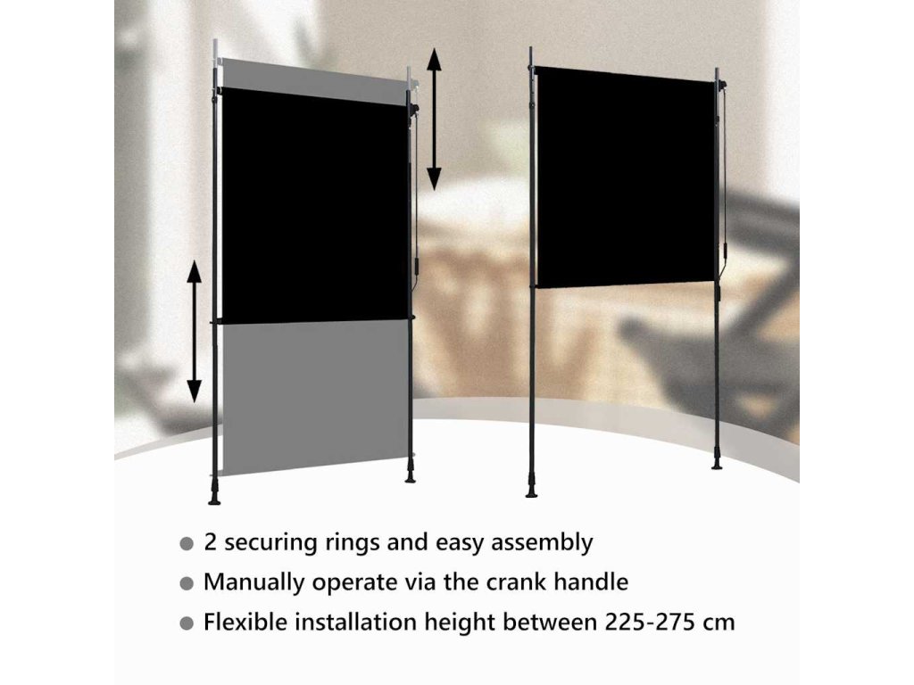 Roleta je vyrobená z kvalitnej látky s vrstvou PA, a preto na slnku nevybledne, blokuje slnečné lúče, no zároveň prepúšťa vzduch. Dá sa jednoducho vytiahnuť a zrolovať pomocou ručnej kľuky. Vertikálna roleta sa dodáva spolu s dvoma stojacími stĺpikmi s nastaviteľnou výškou od 2 do 3 metrov, takže sa vojde pod väčšinu zastropení a jednoducho sa montuje.