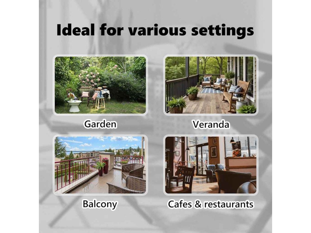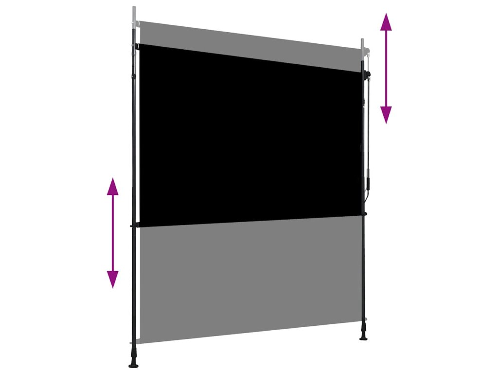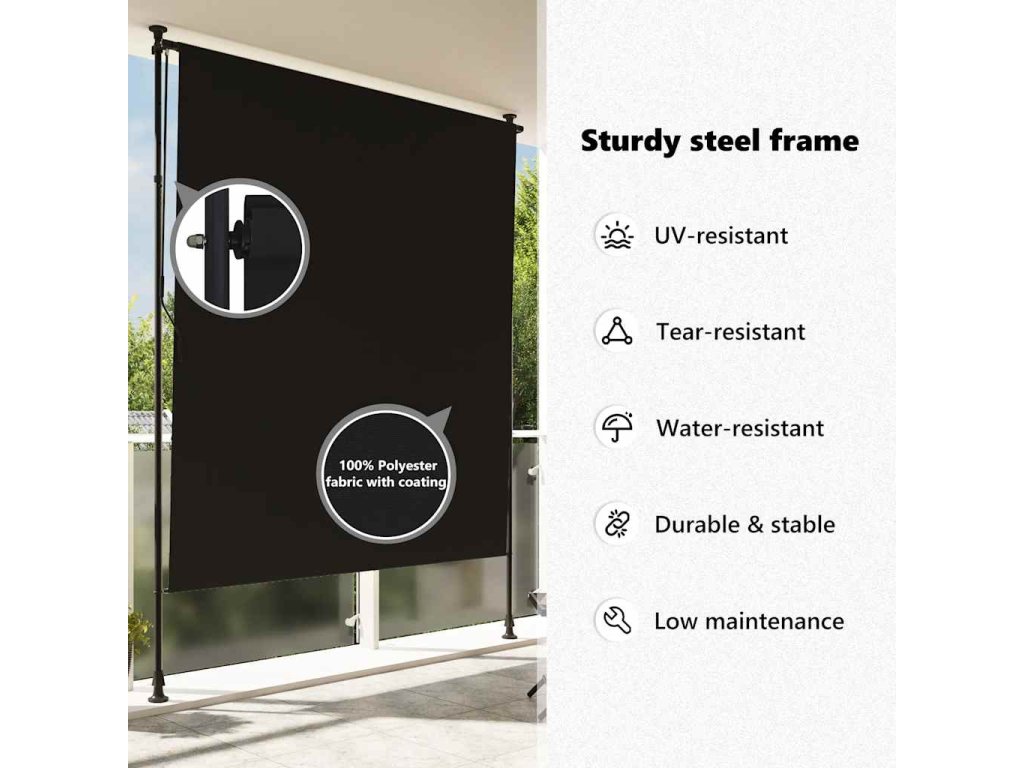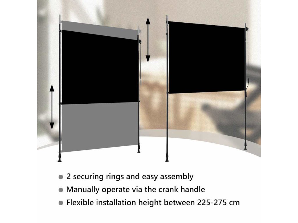 Roleta je vyrobená z kvalitnej látky s vrstvou PA, a preto na slnku nevybledne, blokuje slnečné lúče, no zároveň prepúšťa vzduch. Dá sa jednoducho vytiahnuť a zrolovať pomocou ručnej kľuky. Vertikálna roleta sa dodáva spolu s dvoma stojacími stĺpikmi s nastaviteľnou výškou od 2 do 3 metrov, takže sa vojde pod väčšinu zastropení a jednoducho sa montuje.