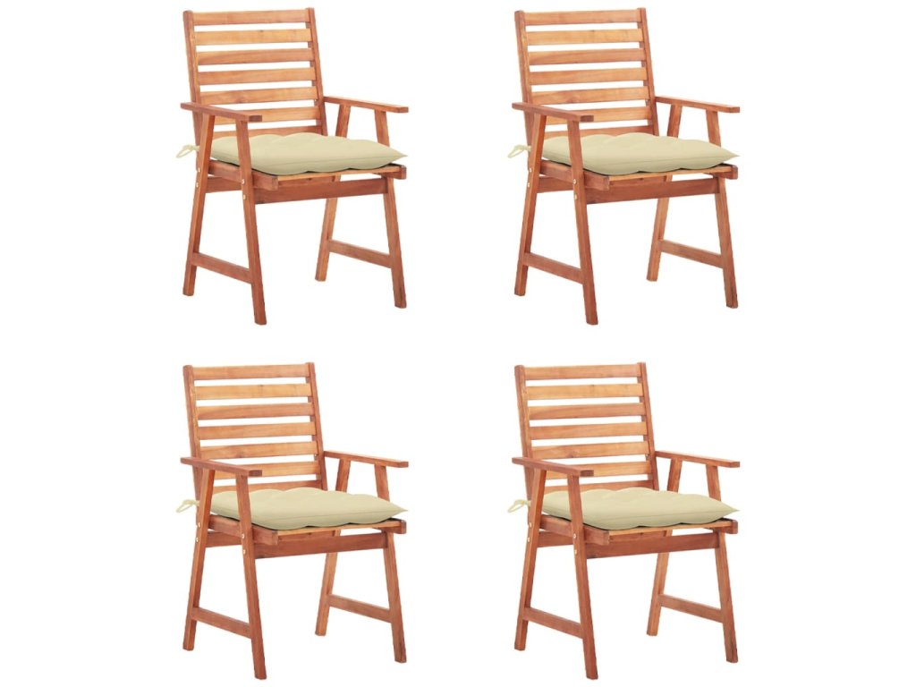 Tieto záhradné stoličky sú vyrobené z masívneho akáciového dreva, tropického tvrdého dreva, ktoré je odolné voči poveternostným vplyvom a trvácne pre roky používania. Povrch upravený olejom sa ľahko čistí vlhkou handričkou. Lamelový dizajn jej dáva rustikálne čaro. Navyše podložka poskytuje dodatočné pohodlie počas sedenia. Je vyrobená zo 100% polyesteru, ktorý je upravený tak, aby bol vode odolný. Každý vankúš má dve sady povrázkov, ktorými sa pevne pripevní k stoličke.