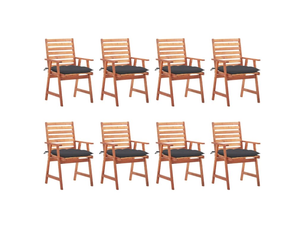Tieto záhradné stoličky sú vyrobené z masívneho akáciového dreva, tropického tvrdého dreva, ktoré je odolné voči poveternostným vplyvom a trvácne pre roky používania. Povrch upravený olejom sa ľahko čistí vlhkou handričkou. Lamelový dizajn jej dáva rustikálne čaro. Navyše podložka poskytuje dodatočné pohodlie počas sedenia. Je vyrobená zo 100% polyesteru, ktorý je upravený tak, aby bol vode odolný. Každý vankúš má dve sady povrázkov, ktorými sa pevne pripevní k stoličke.