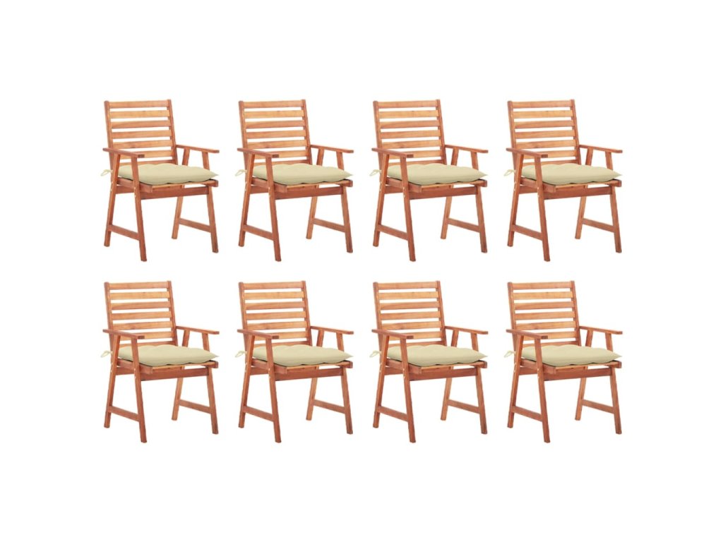 Tieto záhradné stoličky sú vyrobené z masívneho akáciového dreva, tropického tvrdého dreva, ktoré je odolné voči poveternostným vplyvom a trvácne pre roky používania. Povrch upravený olejom sa ľahko čistí vlhkou handričkou. Lamelový dizajn jej dáva rustikálne čaro. Navyše podložka poskytuje dodatočné pohodlie počas sedenia. Je vyrobená zo 100% polyesteru, ktorý je upravený tak, aby bol vode odolný. Každý vankúš má dve sady povrázkov, ktorými sa pevne pripevní k stoličke.