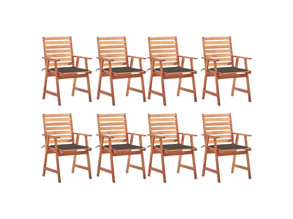 Tieto záhradné stoličky sú vyrobené z masívneho akáciového dreva, tropického tvrdého dreva, ktoré je odolné voči poveternostným vplyvom a trvácne pre roky používania. Povrch upravený olejom sa ľahko čistí vlhkou handričkou. Lamelový dizajn jej dáva rustikálne čaro. Navyše podložka poskytuje dodatočné pohodlie počas sedenia. Je vyrobená zo 100% polyesteru, ktorý je upravený tak, aby bol vode odolný. Každý vankúš má dve sady povrázkov, ktorými sa pevne pripevní k stoličke.