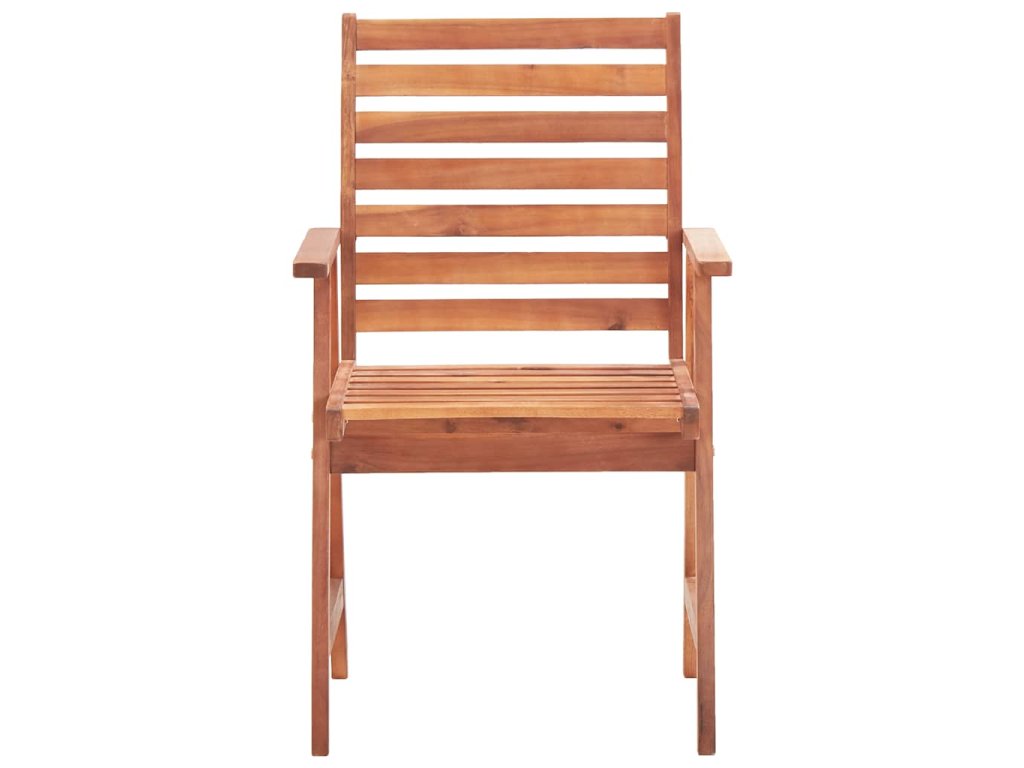 Tieto záhradné stoličky sú vyrobené z masívneho akáciového dreva, tropického tvrdého dreva, ktoré je odolné voči poveternostným vplyvom a trvácne pre roky používania. Povrch upravený olejom sa ľahko čistí vlhkou handričkou. Lamelový dizajn jej dáva rustikálne čaro. Navyše podložka poskytuje dodatočné pohodlie počas sedenia. Je vyrobená zo 100% polyesteru, ktorý je upravený tak, aby bol vode odolný. Každý vankúš má dve sady povrázkov, ktorými sa pevne pripevní k stoličke.