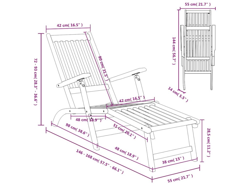 - Celkové rozmery (po úplnom sklopení operadla): 168 x 55 x 72 cm (D x Š x V)