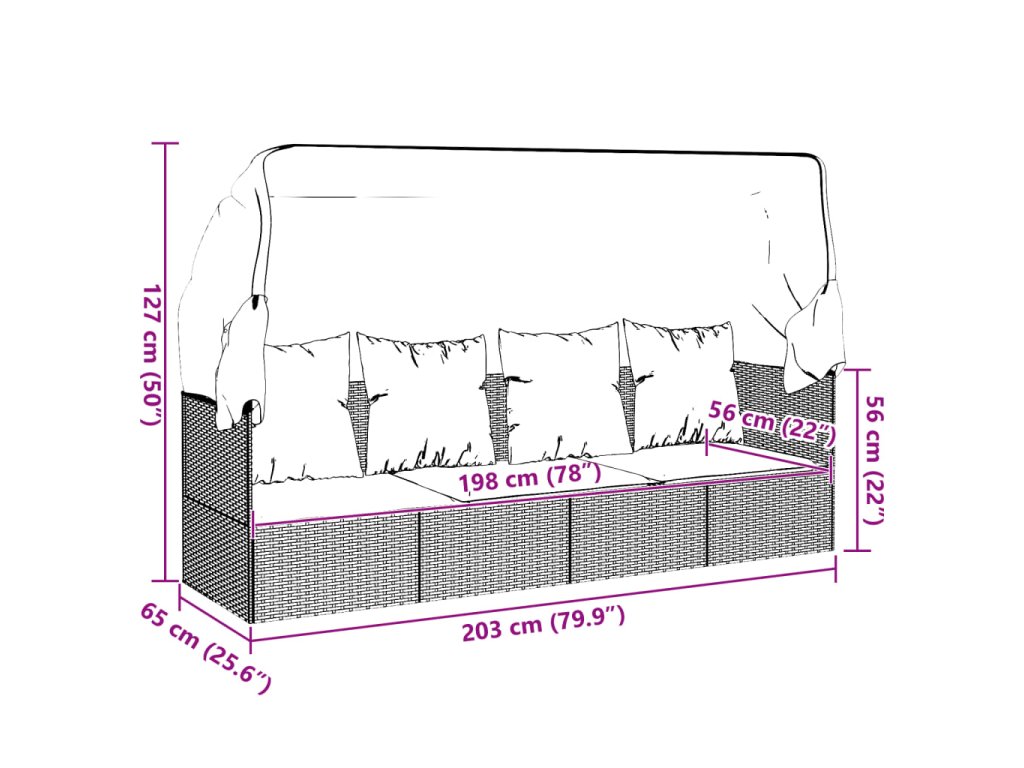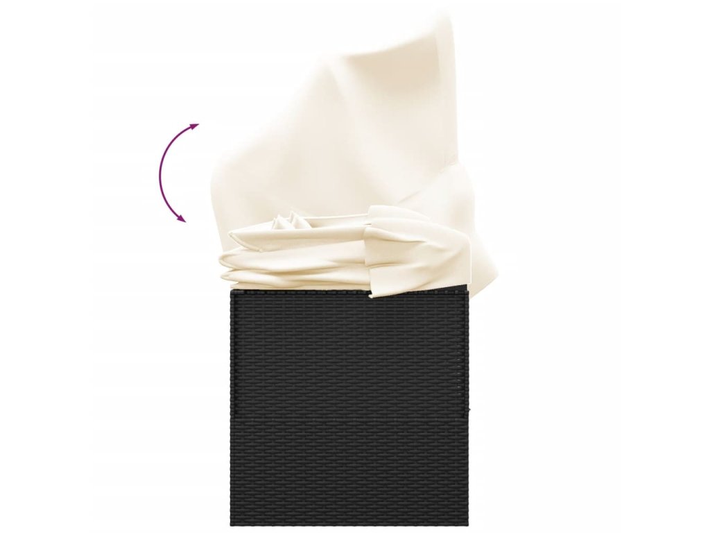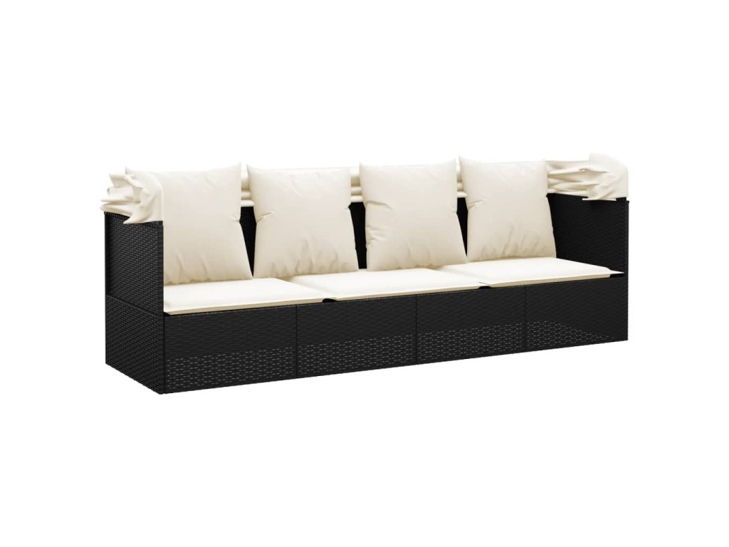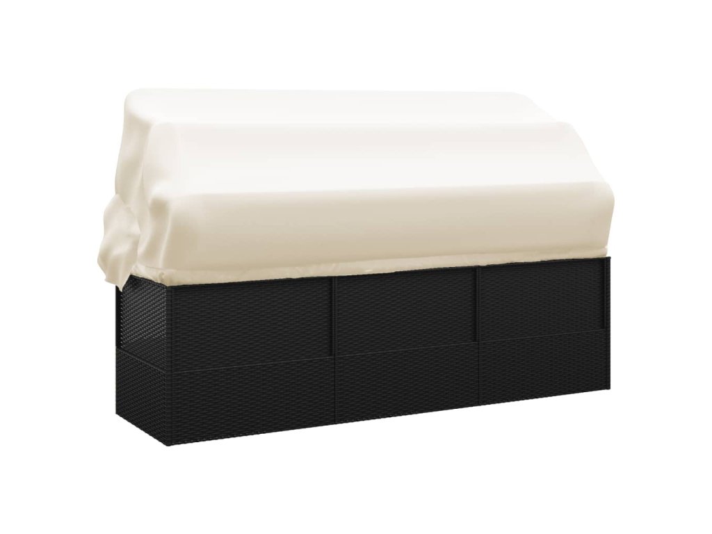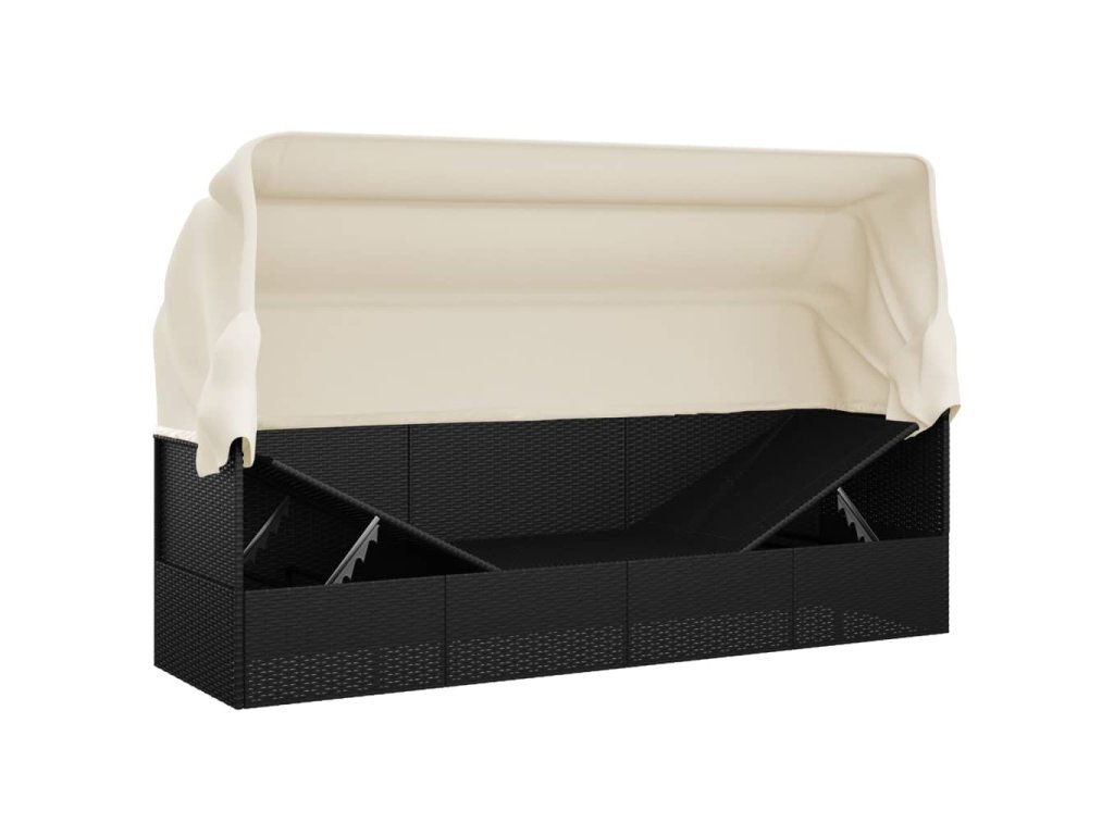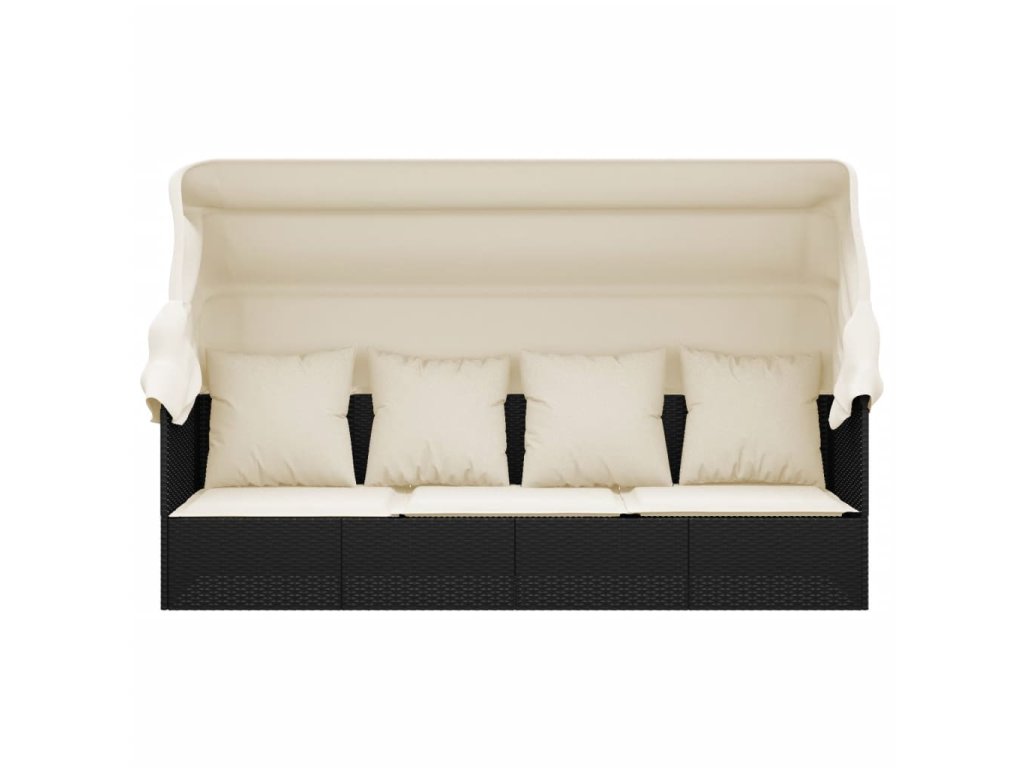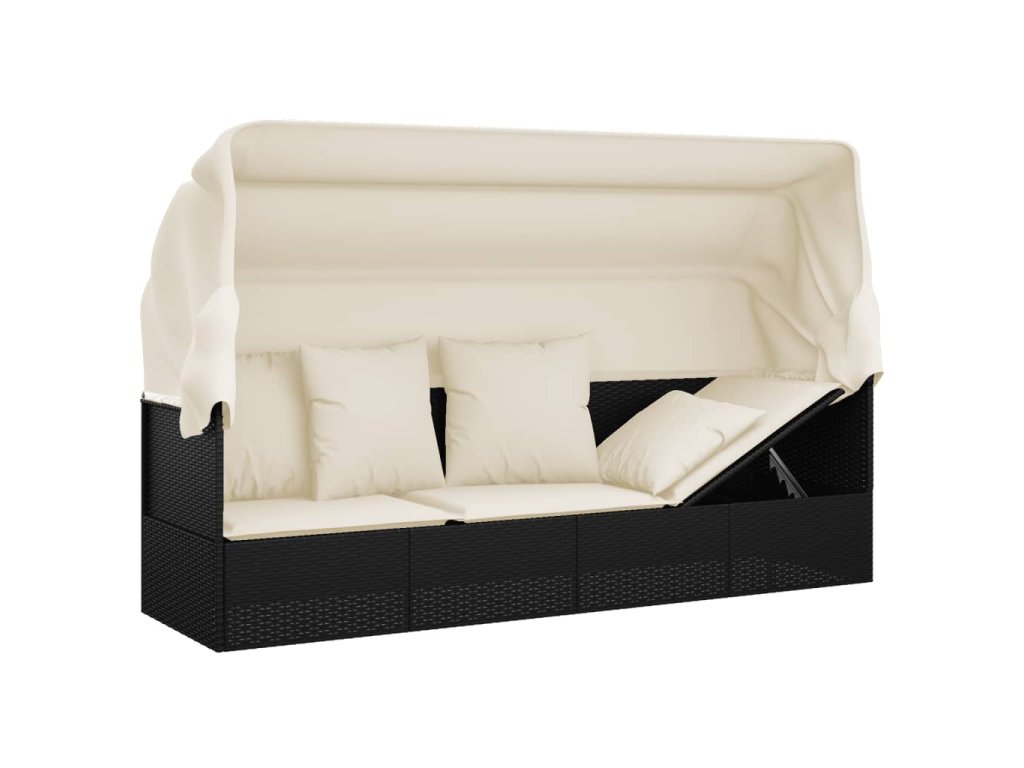 Toto pohodlné vonkajšie lôžko so strechou a vankúšmi je dokonalou kombináciou štýlu a funkčnosti.