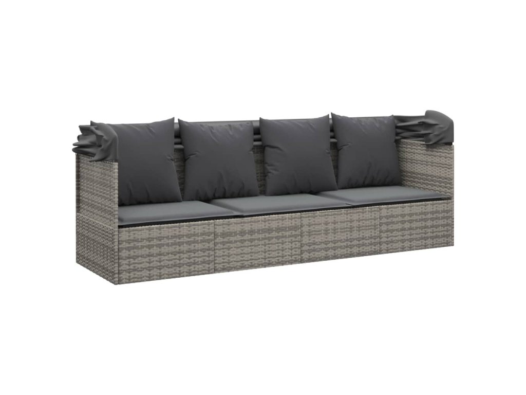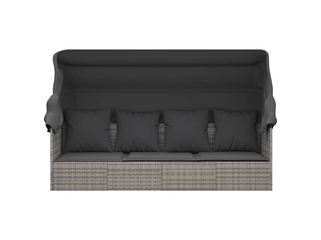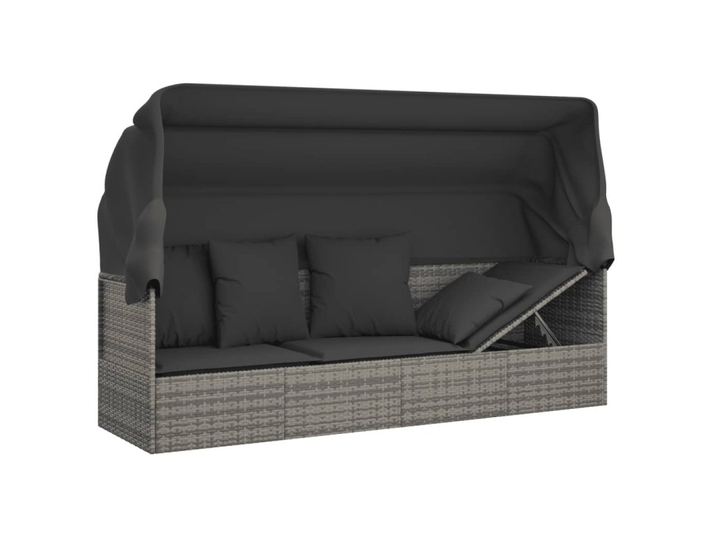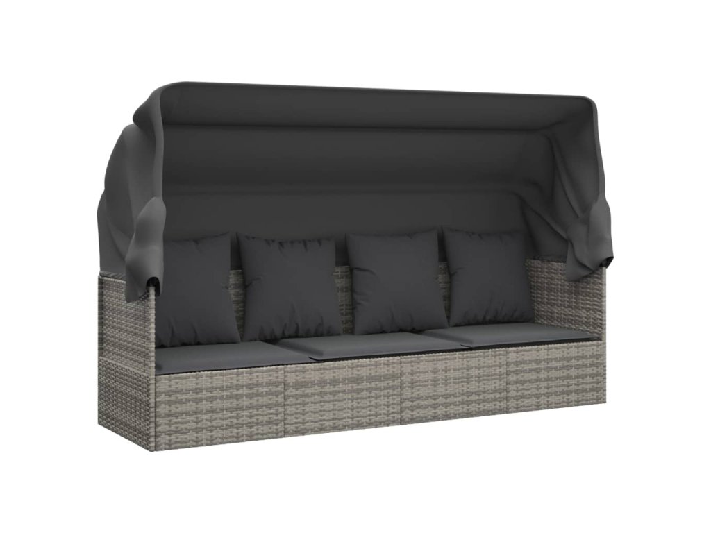 Toto pohodlné vonkajšie lôžko so strechou a vankúšmi je dokonalou kombináciou štýlu a funkčnosti.