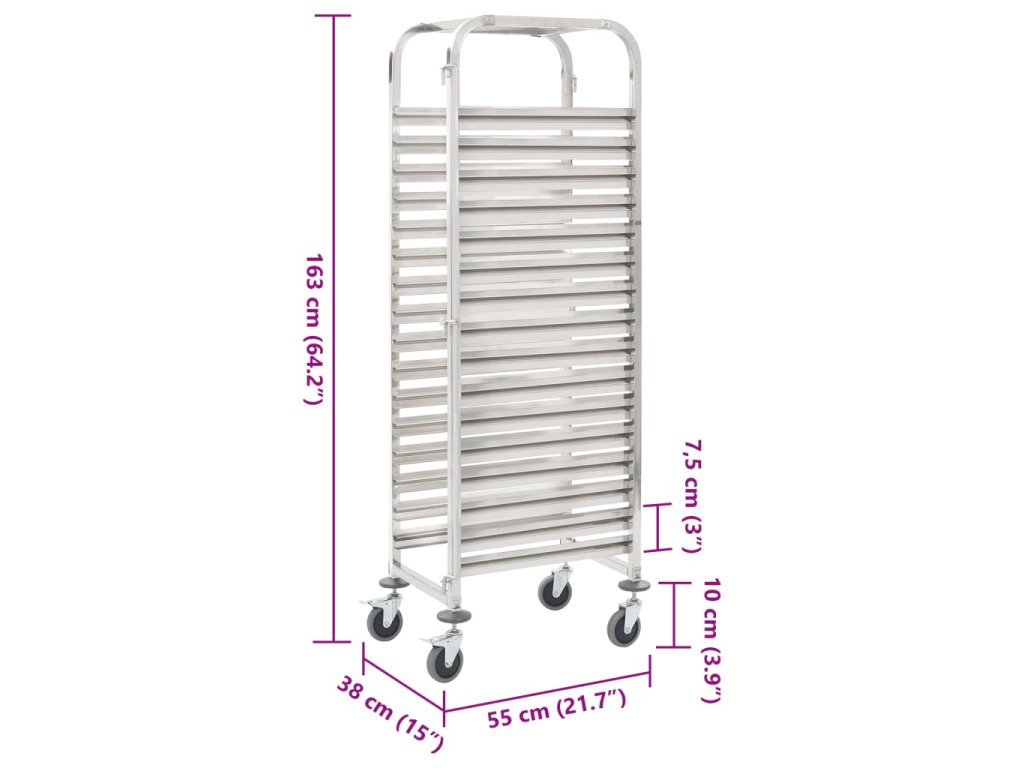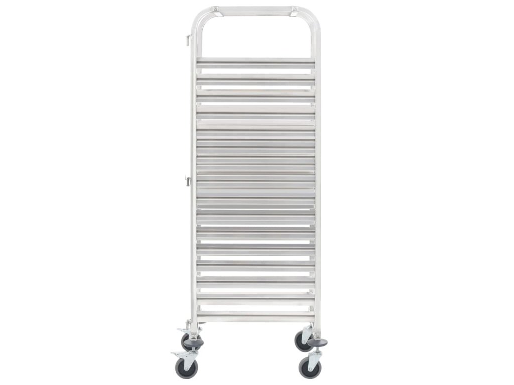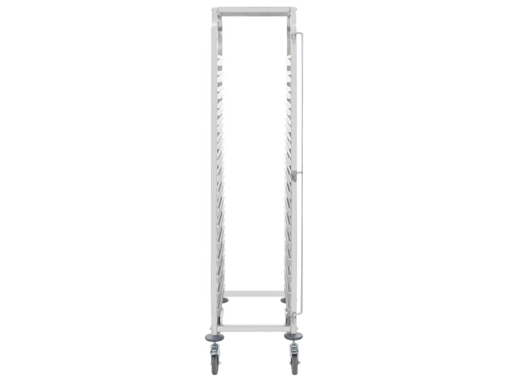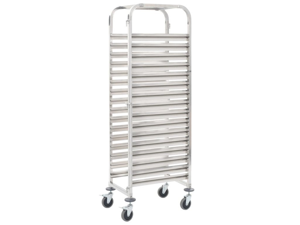Vozík má priestor pre 16 podnosov, čo umožní využiť dostatok úložného priestoru v malom priestore. Vďaka rámu z nehrdzavejúcej ocele je vozík na podnosy stabilný a pevný aj pri plnom zaťažení. Kolieska sa pohybujú plynule, a tak budete môcť manipulovať s vozíkom bez námahy a potichu. Dve kolieska sú navyše vybavené brzdami, aby vozík zostal stáť na mieste.