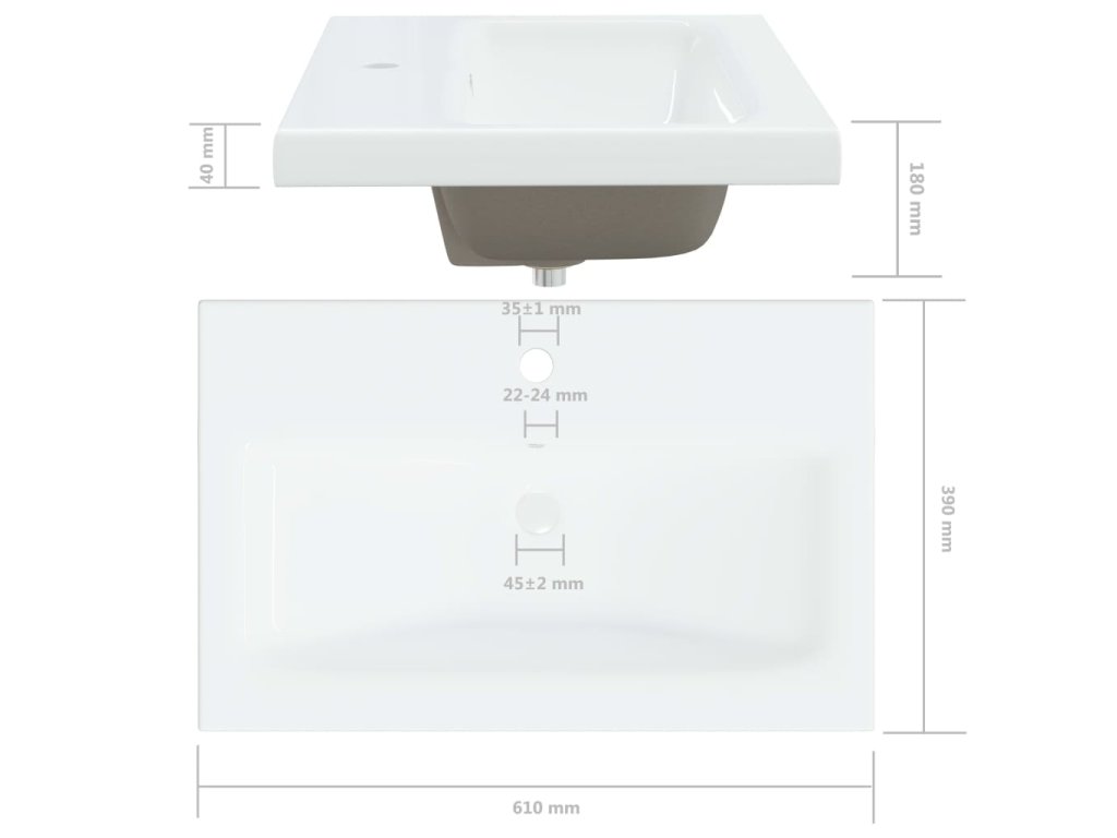 - Rozmery umývadla: 61 x 39 x 18 cm (D x Š x V)