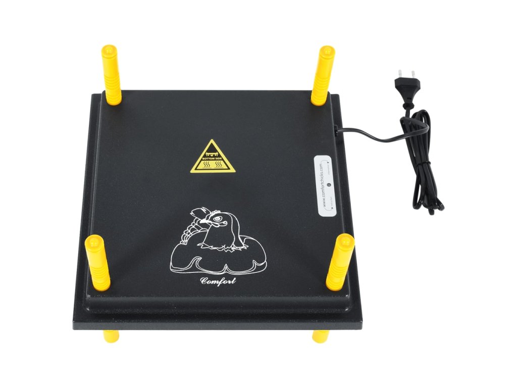 Výhrevná platnička je vhodná pre približne 20 až 25 mláďat a poskytuje náhradu prirodzeného tepla matky. Výhodou je, že mláďatá dokážu nájsť teplo, keď ho budú potrebovať. Doska sa dá ľahko nastaviť tak, aby presne vyhovovala požiadavkám mláďat, a to stlačením žltých rýchloupínacích svoriek na spodnej strane dosky. Táto umelá kvočka pre kuriatka spotrebuje oveľa menej energie ako tepelná lampa, vďaka čomu je jej používanie úsporné. Je vybavená teplotnou poistkou a odporovou poistkou pre dvojitú bezpečnosť.