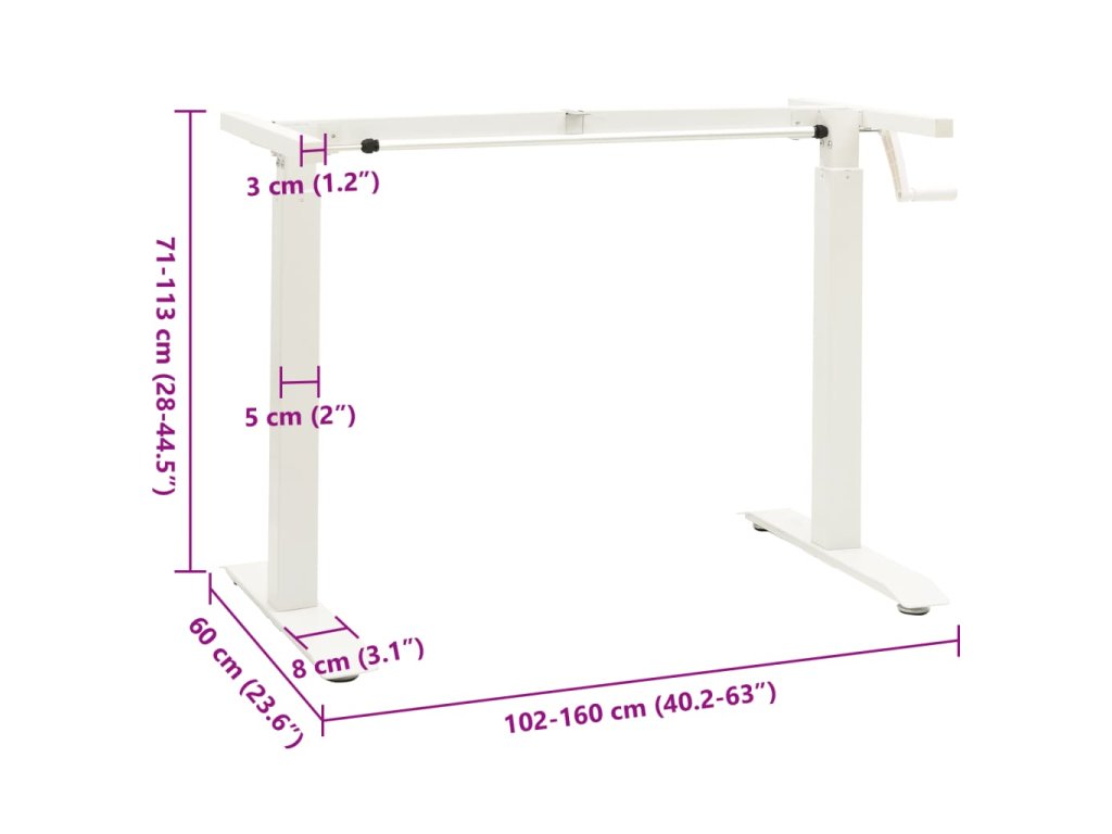 Tento stabilný rám stola je vyrobený z uhlíkovej ocele s práškovou povrchovou úpravou. Má nastaviteľnú šírku od 102 cm do 160 cm a výšku od 71 cm do 113 cm, aby ste si ho mohli prispôsobiť podľa potreby. Rám je vybavený ručnou kľukou pre ľahké a rýchle upravenie. Môžete naň namontovať vašu pracovnú dosku, a tak dokonale zapadne do vášho pracovného priestoru. Rám je vhodný na stoly so šírkou 120-180 cm a hĺbkou 60-80 cm.