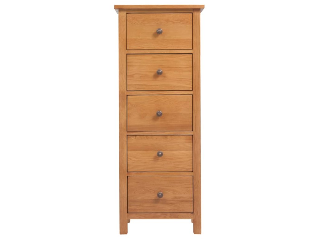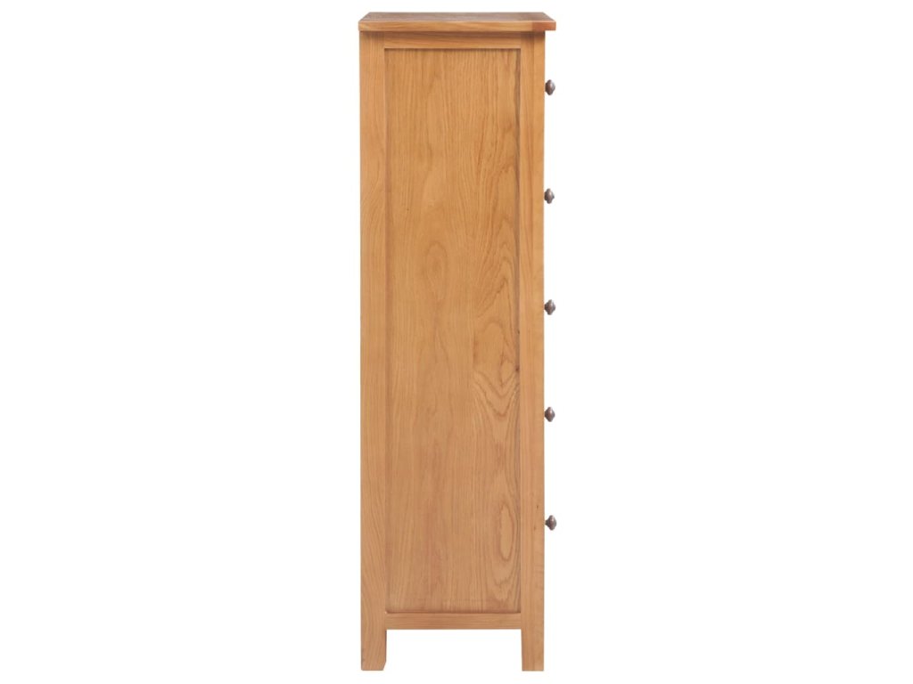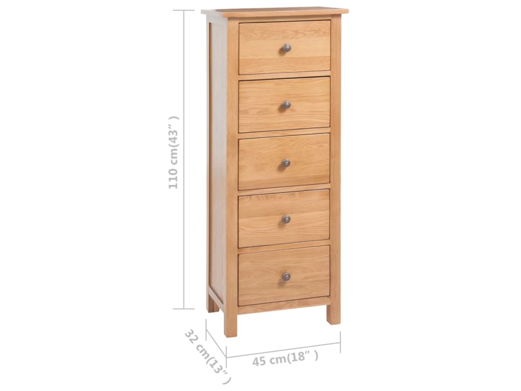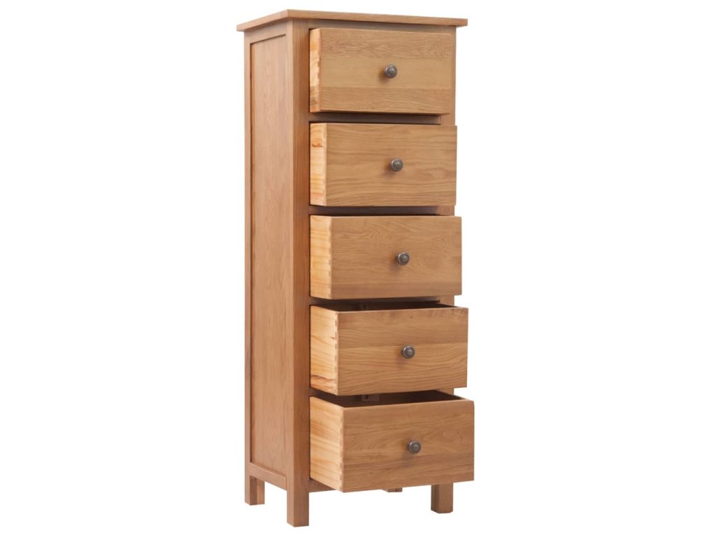 Táto vysoká skrinka je vyrobená z masívneho dubového dreva, vďaka čomu má príjemný vzhľad a je mimoriadne stabilná a odolná. Bočná skrinka poskytuje dostatok úložného priestoru pre vaše osobné veci, čím pomôže udržiavať poriadok vo vašej izbe. Extra vysoký dizajn s 5 zásuvkami, ktoré majú hladký chod, je ideálny na ukladanie všetkých druhov malých predmetov, ako sú knihy, DVD, poznámkové bloky, perá a iné drobnosti.