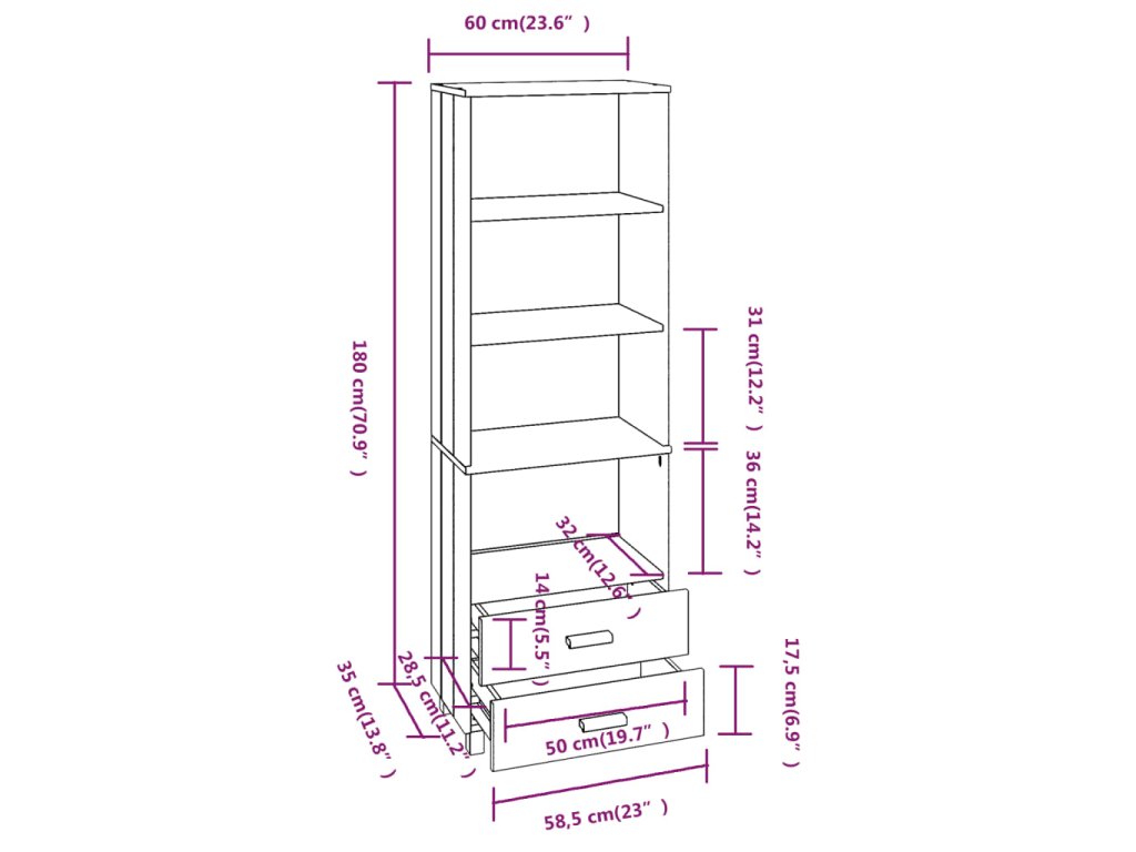 Zásuvková skrinka je vyrobená z masívneho borovicového dreva, vďaka čomu je stabilná a pevná. Vysoká skrinka má police a zásuvky, ktoré poskytujú dostatok úložného priestoru na uloženie alebo vystavenie vašich osobných vecí, ako sú knihy, starožitnosti, fotorámiky a ďalšie. Zásuvky v spodnej časti ponúkajú priestor, aby ste mali menšie predmety prehľadne usporiadané a na dosah ruky.