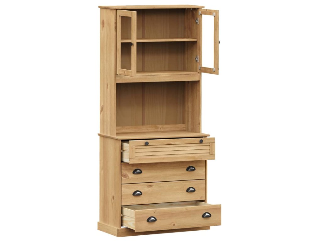 - Materiál: Masívne borovicové drevo s medovou voskovou úpravou, kompozitné drevo, kov, sklo