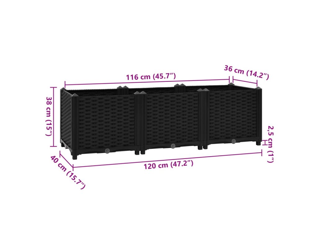 Tento kvetináč je vyrobený z polypropylénu, vďaka čomu je pevný, odolný a vhodný na každodenné vonkajšie použitie. Záhradný kvetináč je dostatočne hlboký a široký, aby pojal veľké množstvo pôdy a poskytuje dostatok priestoru pre vaše rastliny, zeleninu, bylinky a kvety. Vytvorte nádherné prostredie pre rastliny pomocou tohto elegantného záhonu!