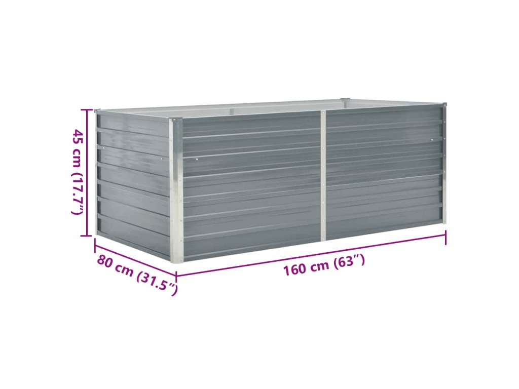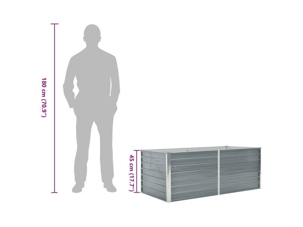 Tento vyvýšený záhon je mimoriadne trvácny a kvalitne vyhotovený. Je dostatočne hlboký a široký, aby sa doň zmestilo veľké množstvo pôdy, a poskytne dostatok priestoru na pestovanie rastlín, zeleniny, byliniek a kvetov. Vďaka jednoduchému dizajnu v tvare obdĺžnika predstavuje štýlový doplnok na balkón, na terasu či do dvora. Je vyrobený z pozinkovanej ocele a vybavený vnútornými opornými držiakmi, a tak je skutočne pevný a trvácny. Okraje kvetináča sú zaoblené, aby sa na ňom nenachádzali žiadne nebezpečné hrany.