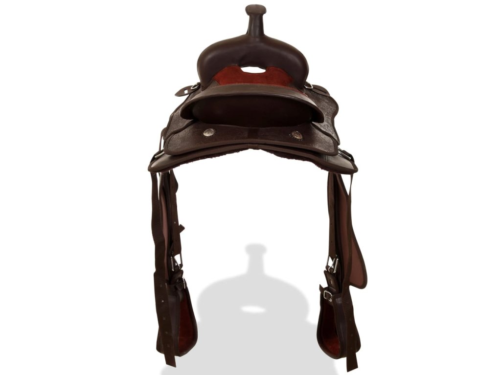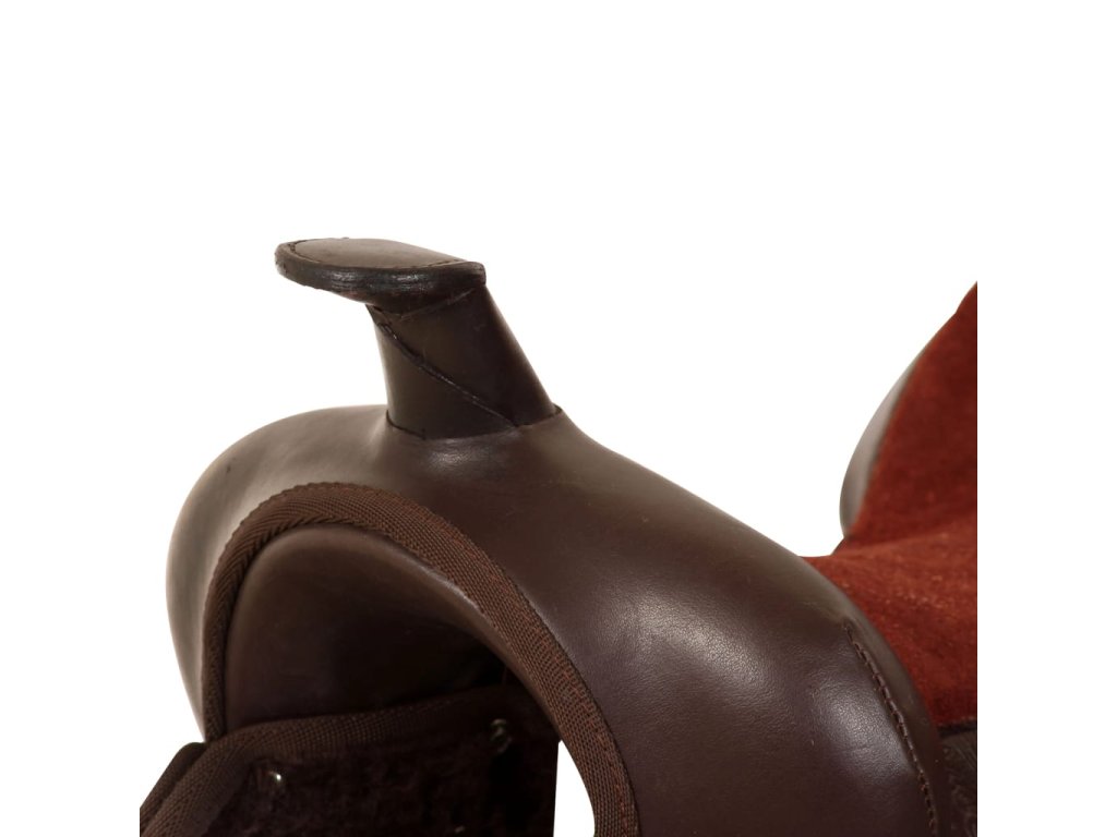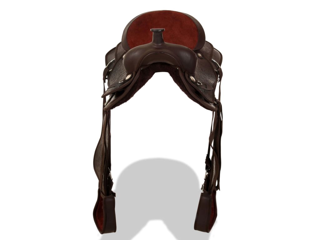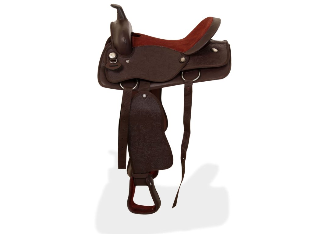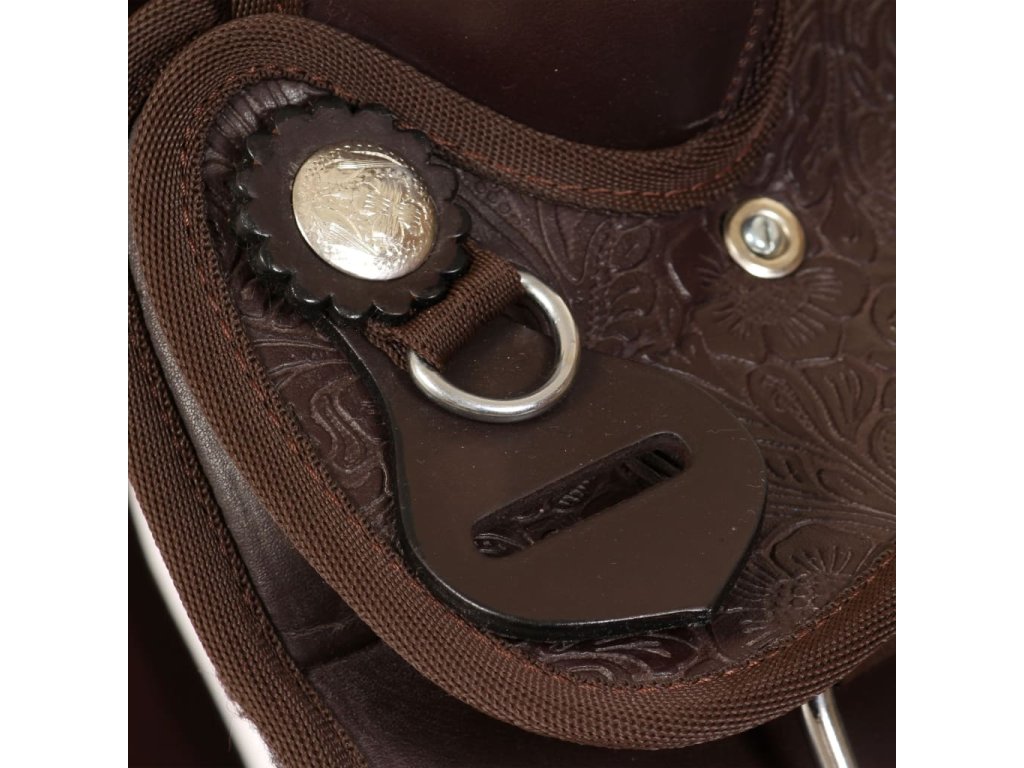 Vysokokvalitná pravá koža a umelá koža je vyzdobená kvetinovým vzorom, čo znamená, že sedlo má nielen funkčnú, ale aj dekoratívnu funkciu. Westernové sedlo je vystužené na všetkých tlakových bodoch pre vyššiu trvácnosť. Kožené strmene, strmeňový remeň a sedlová komora sú robustné a odolné. Toto sedlo je veľmi pohodlné, takže kôň aj jazdec môžu dlhé hodiny jazdiť.