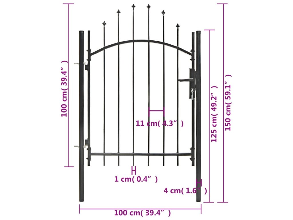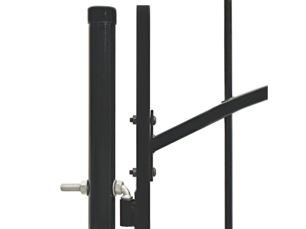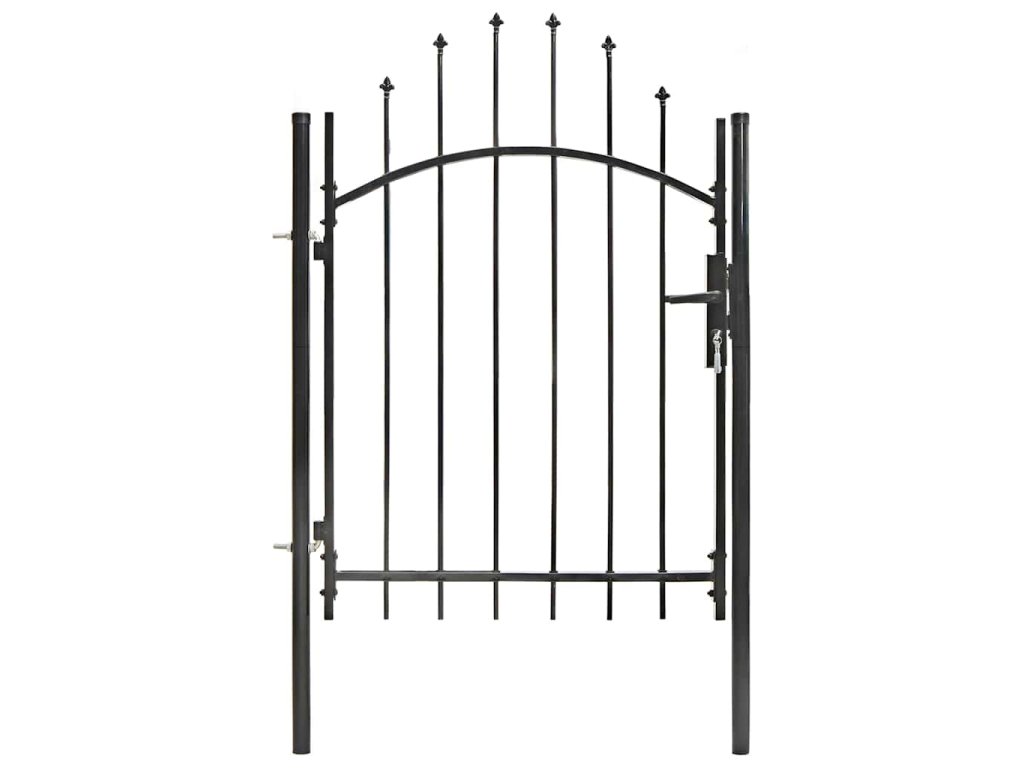 Vrchná časť záhradnej brány má elegantný zaoblený dizajn a vďaka pevným vodorovným oporným tyčiam na spevnenie rámu brána poskytuje optimálnu bezpečnosť a súkromie, a zároveň vytvára pôsobivý vstup na pozemok. Brána je vyrobená z pevnej ocele s práškovou povrchovou úpravou, ktorá je odolná voči hrdzi a korózii. Plotová brána je vybavená uzamykacím systémom a dodáva sa spolu s dvoma pevnými stĺpikmi a robustnými pántmi pre jednoduchú inštaláciu.
