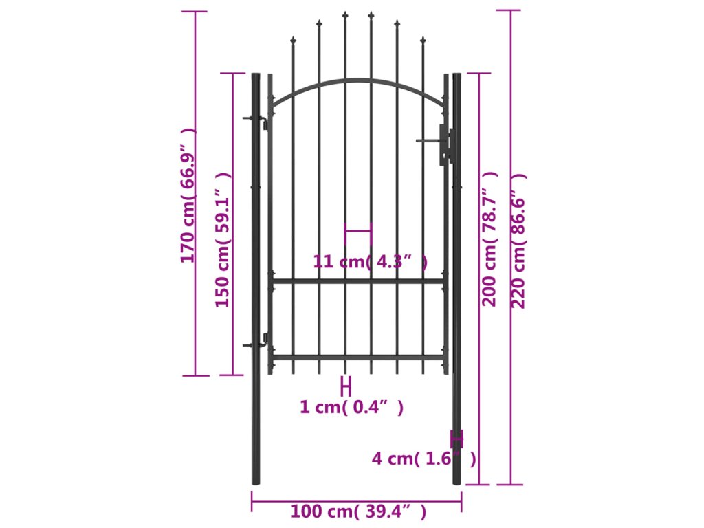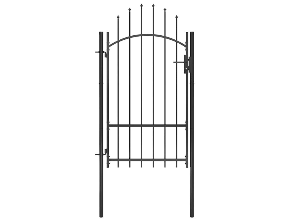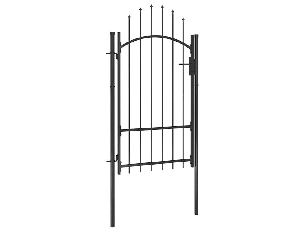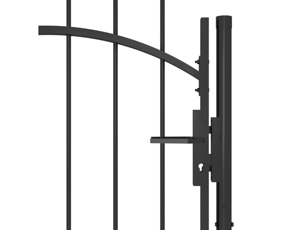 Vrchná časť záhradnej brány má elegantný zaoblený dizajn a vďaka pevným vodorovným oporným tyčiam na spevnenie rámu brána poskytuje optimálnu bezpečnosť a súkromie, a zároveň vytvára pôsobivý vstup na pozemok. Brána je vyrobená z pevnej ocele s práškovou povrchovou úpravou, ktorá je odolná voči hrdzi a korózii. Plotová brána je vybavená uzamykacím systémom a dodáva sa spolu s dvoma pevnými stĺpikmi a robustnými pántmi pre jednoduchú inštaláciu.