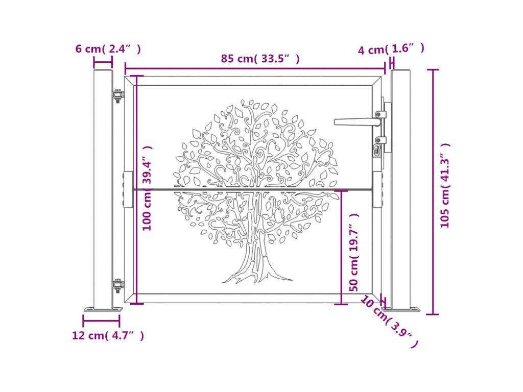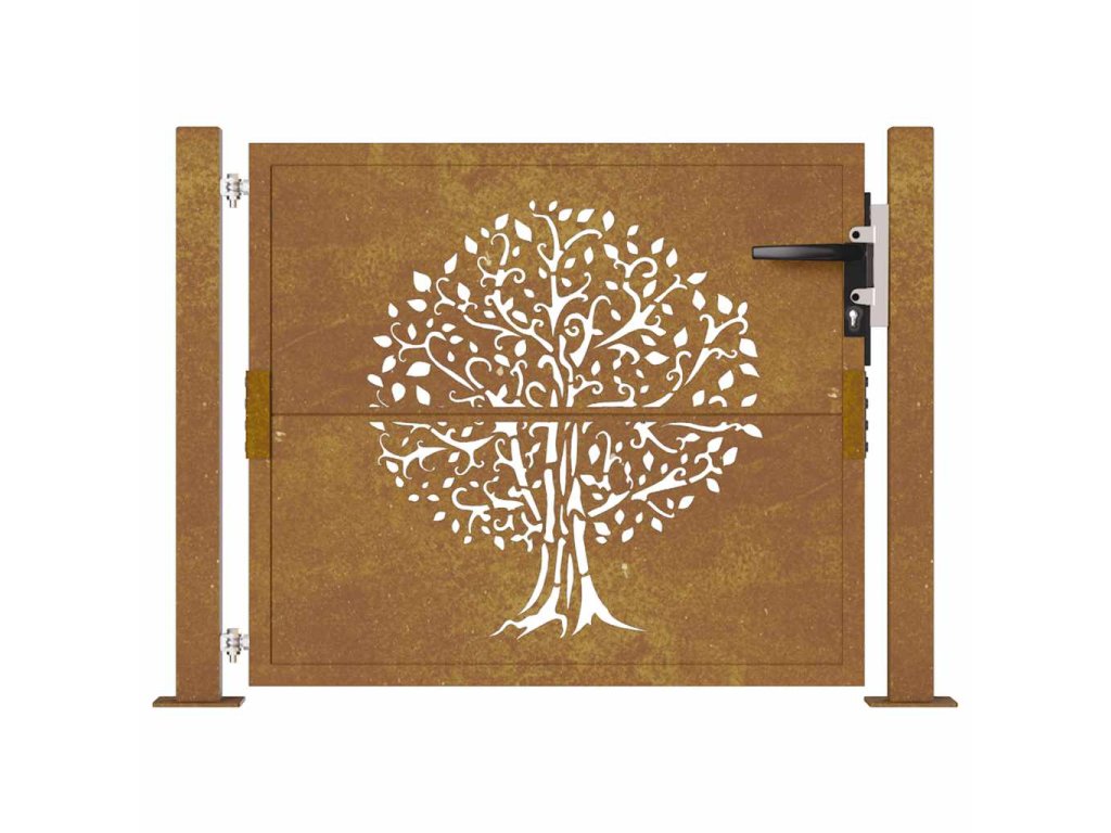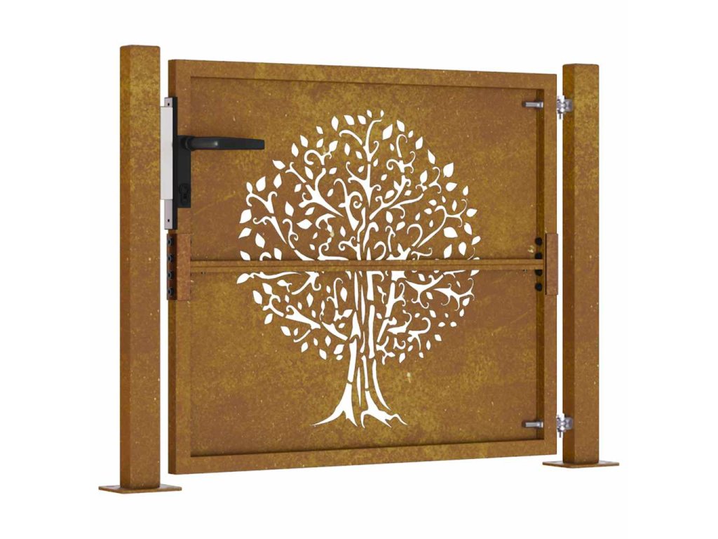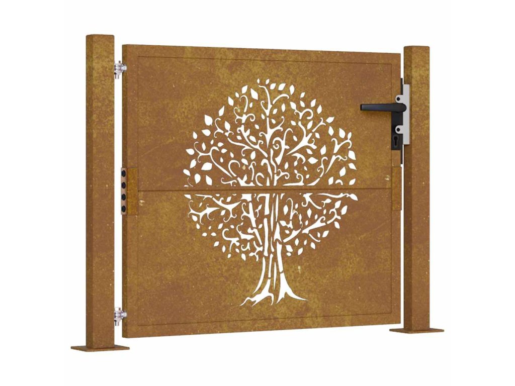 - Odolná konštrukcia: Táto plotová brána je vyrobená z kortenovej ocele. Kortenová oceľ, tiež známa ako oceľ odolná voči poveternostným vplyvom. Je vo svojej podstate antikorózna. Pri prvom vystavení atmosférickým podmienkam sa na nej vytvorí hrdzavá vrstva, ktorá chráni pred koróziou. Preto ju nemusíte natierať. Vďaka tomu ušetríte náklady na údržbu a opravy. Výrazný hnedý odtieň cortenovej ocele zaručene upúta pozornosť. Oceľ je odolná voči poveternostným podmienkam, a je mimoriadne trvácna a obstojí v skúške časom.