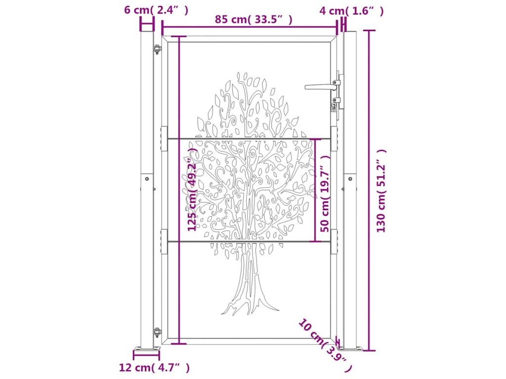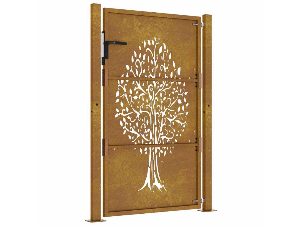 - Odolná konštrukcia: Táto plotová brána je vyrobená z kortenovej ocele. Kortenová oceľ, tiež známa ako oceľ odolná voči poveternostným vplyvom. Je vo svojej podstate antikorózna. Pri prvom vystavení atmosférickým podmienkam sa na nej vytvorí hrdzavá vrstva, ktorá chráni pred koróziou. Preto ju nemusíte natierať. Vďaka tomu ušetríte náklady na údržbu a opravy. Výrazný hnedý odtieň cortenovej ocele zaručene upúta pozornosť. Oceľ je odolná voči poveternostným podmienkam, a je mimoriadne trvácna a obstojí v skúške časom.