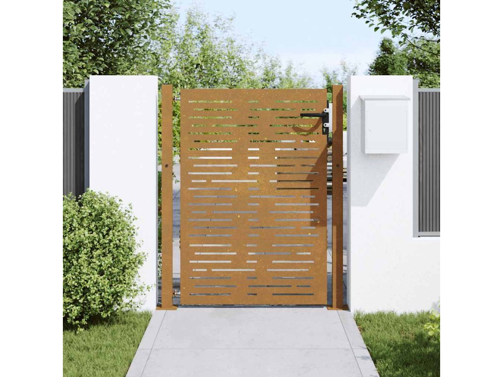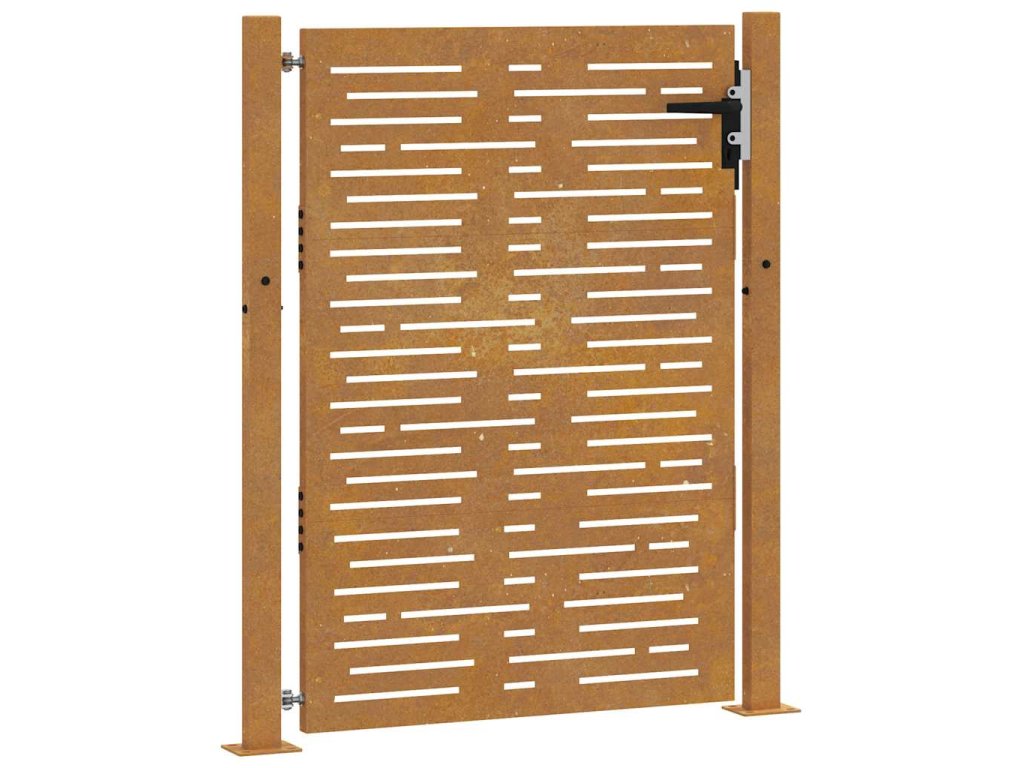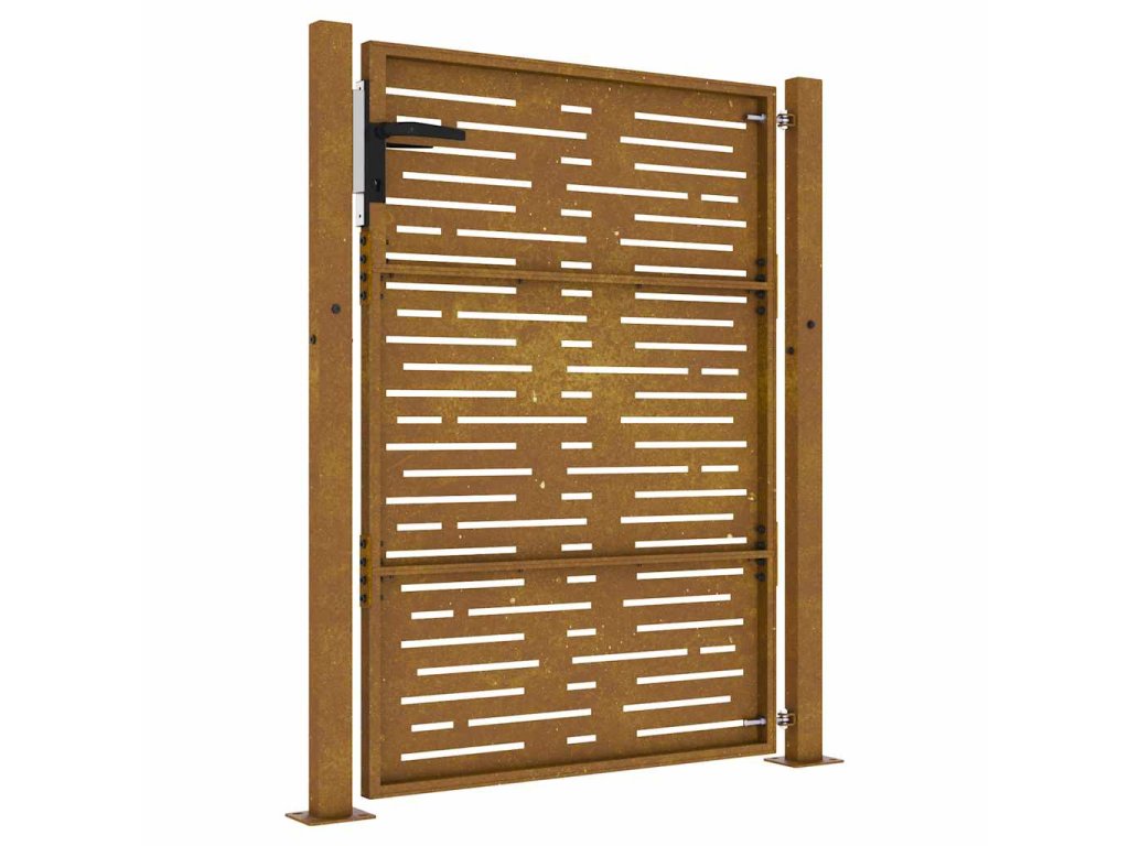 - Odolný materiál: Kovová brána je vyrobená z kortenovej ocele. Kortenová oceľ, tiež známa ako oceľ odolná voči poveternostným vplyvom. Je vo svojej podstate antikorózna. Pri prvom vystavení atmosférickým podmienkam sa na nej vytvorí hrdzavá vrstva, ktorá chráni pred koróziou. Preto ju nemusíte natierať. Vďaka tomu ušetríte náklady na údržbu a opravy. Výrazný hnedý odtieň cortenovej ocele zaručene upúta pozornosť. Poveternostne odolná oceľ je mimoriadne trvácna a obstojí v skúške časom.