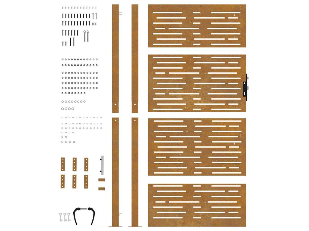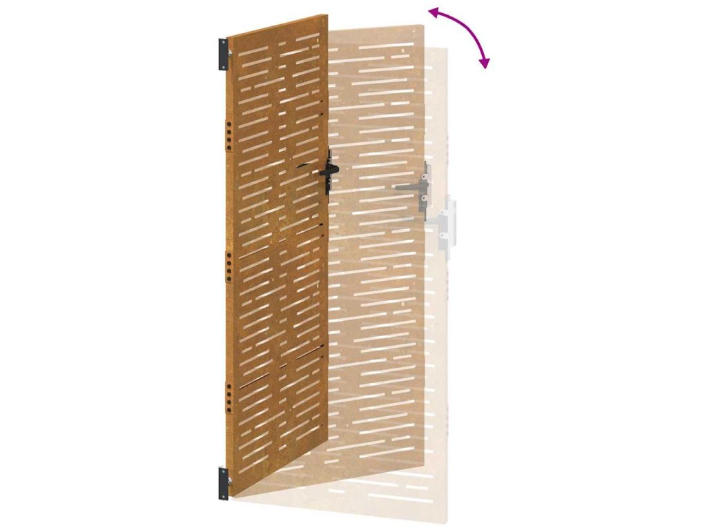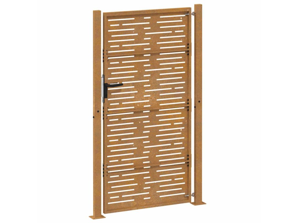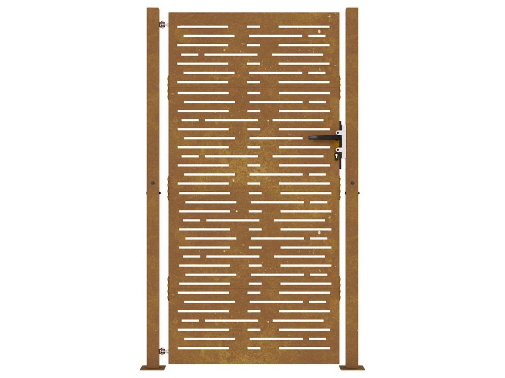 - Odolný materiál: Kovová brána je vyrobená z kortenovej ocele. Kortenová oceľ, tiež známa ako oceľ odolná voči poveternostným vplyvom. Je vo svojej podstate antikorózna. Pri prvom vystavení atmosférickým podmienkam sa na nej vytvorí hrdzavá vrstva, ktorá chráni pred koróziou. Preto ju nemusíte natierať. Vďaka tomu ušetríte náklady na údržbu a opravy. Výrazný hnedý odtieň cortenovej ocele zaručene upúta pozornosť. Poveternostne odolná oceľ je mimoriadne trvácna a obstojí v skúške časom.