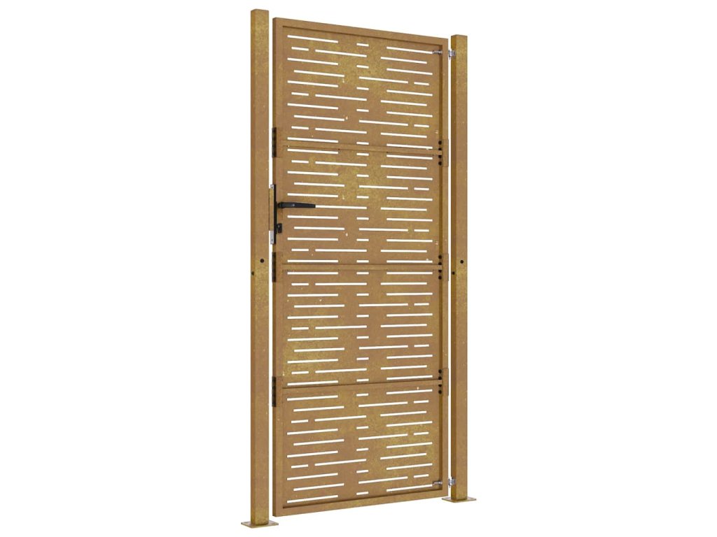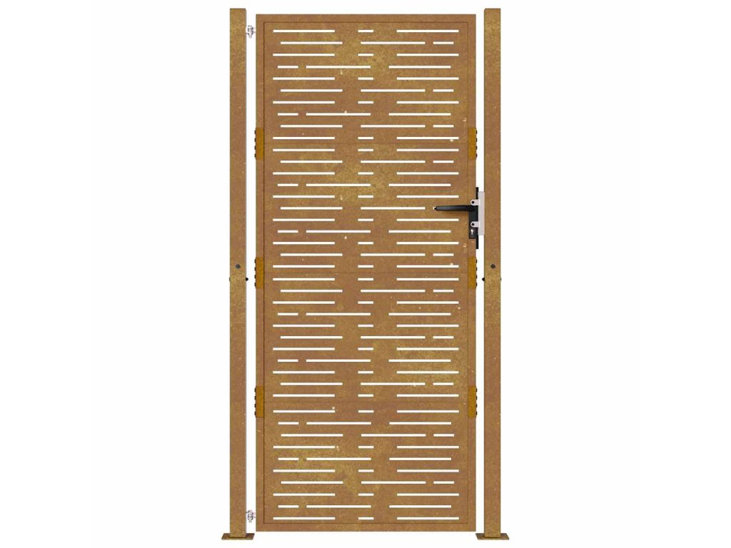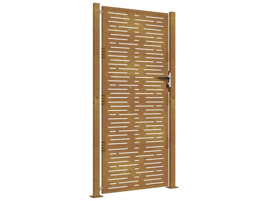 - Odolná konštrukcia: Táto plotová brána je vyrobená z kortenovej ocele. Kortenová oceľ, tiež známa ako oceľ odolná voči poveternostným vplyvom. Je vo svojej podstate antikorózna. Pri prvom vystavení atmosférickým podmienkam sa na nej vytvorí hrdzavá vrstva, ktorá chráni pred koróziou. Preto ju nemusíte natierať. Vďaka tomu ušetríte náklady na údržbu a opravy. Výrazný hnedý odtieň cortenovej ocele zaručene upúta pozornosť. Oceľ je odolná voči poveternostným podmienkam, a je mimoriadne trvácna a obstojí v skúške časom.