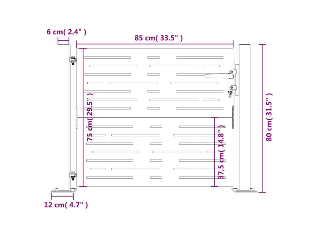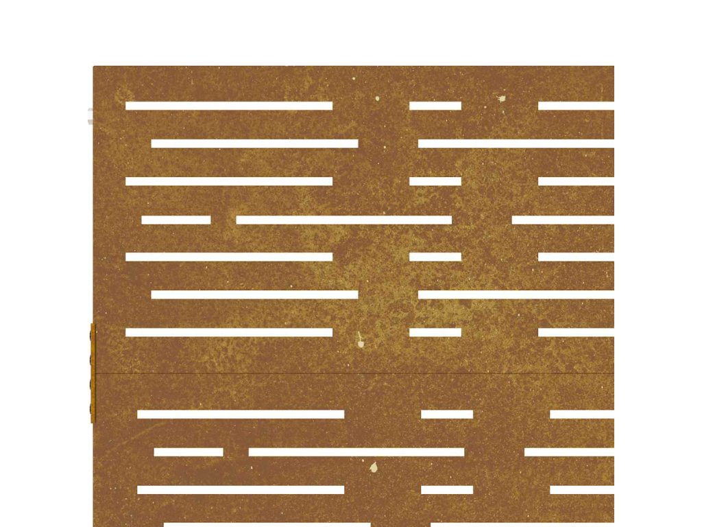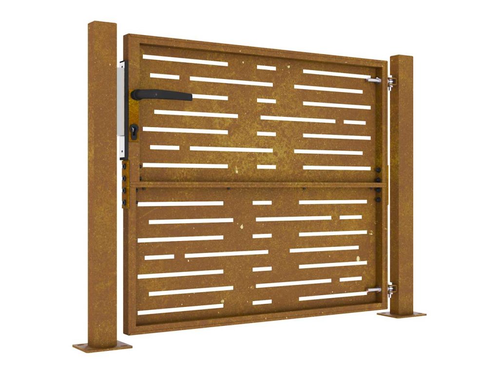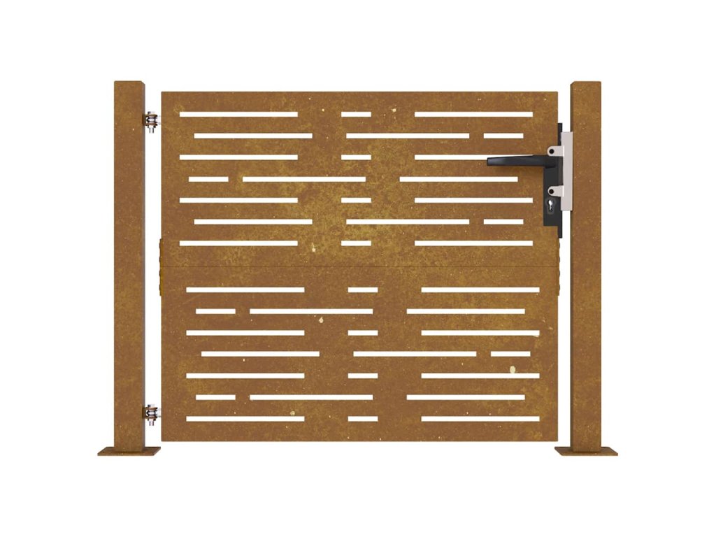 - Odolný materiál: Kovová brána je vyrobená z kortenovej ocele. Kortenová oceľ, tiež známa ako oceľ odolná voči poveternostným vplyvom. Je vo svojej podstate antikorózna. Pri prvom vystavení atmosférickým podmienkam sa na nej vytvorí hrdzavá vrstva, ktorá chráni pred koróziou. Preto ju nemusíte natierať. Vďaka tomu ušetríte náklady na údržbu a opravy. Výrazný hnedý odtieň cortenovej ocele zaručene upúta pozornosť. Poveternostne odolná oceľ je mimoriadne trvácna a obstojí v skúške časom.