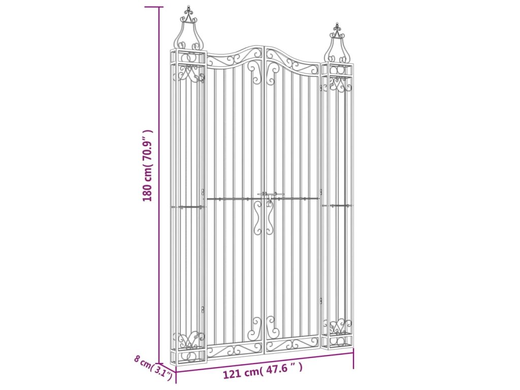 - Uzamykateľný systém: Brána z tepaného železa je dodávaná s otočným závesom pre rýchle uzamykanie na zvýšenie bezpečnosti.