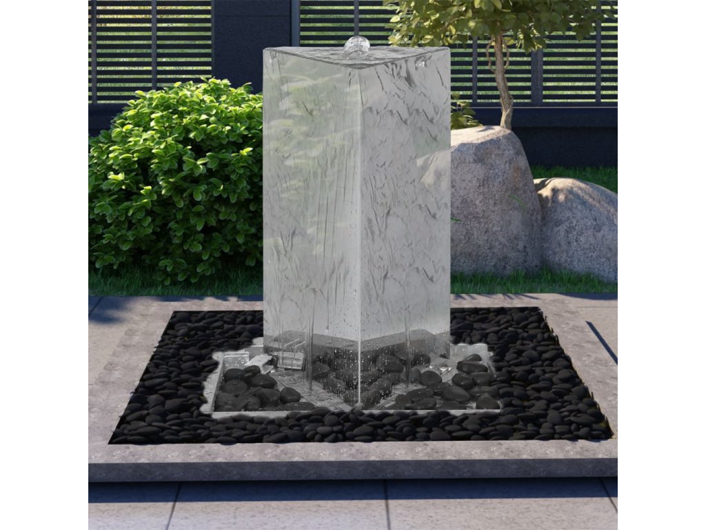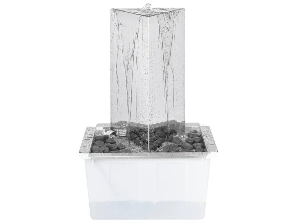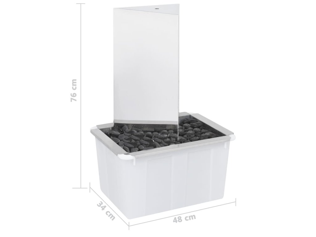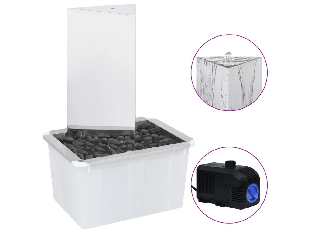 Stĺpová fontána v tvare trojuholníka je vyrobená z prvotriednej nehrdzavejúcej ocele 304, ktorá je odolná voči poškodeniu chlórovanou vodou, vďaka čomu je skutočne trvácna. Je špeciálne navrhnutá tak, aby zaručovala konštantný a rovnomerný prúd vody, a to pomocou čerpadla, ktoré je súčasťou balenia. Dodáva sa spolu s dekoratívnymi kamienkami, ktoré zvýrazňujú prírodný vzhľad fontány.