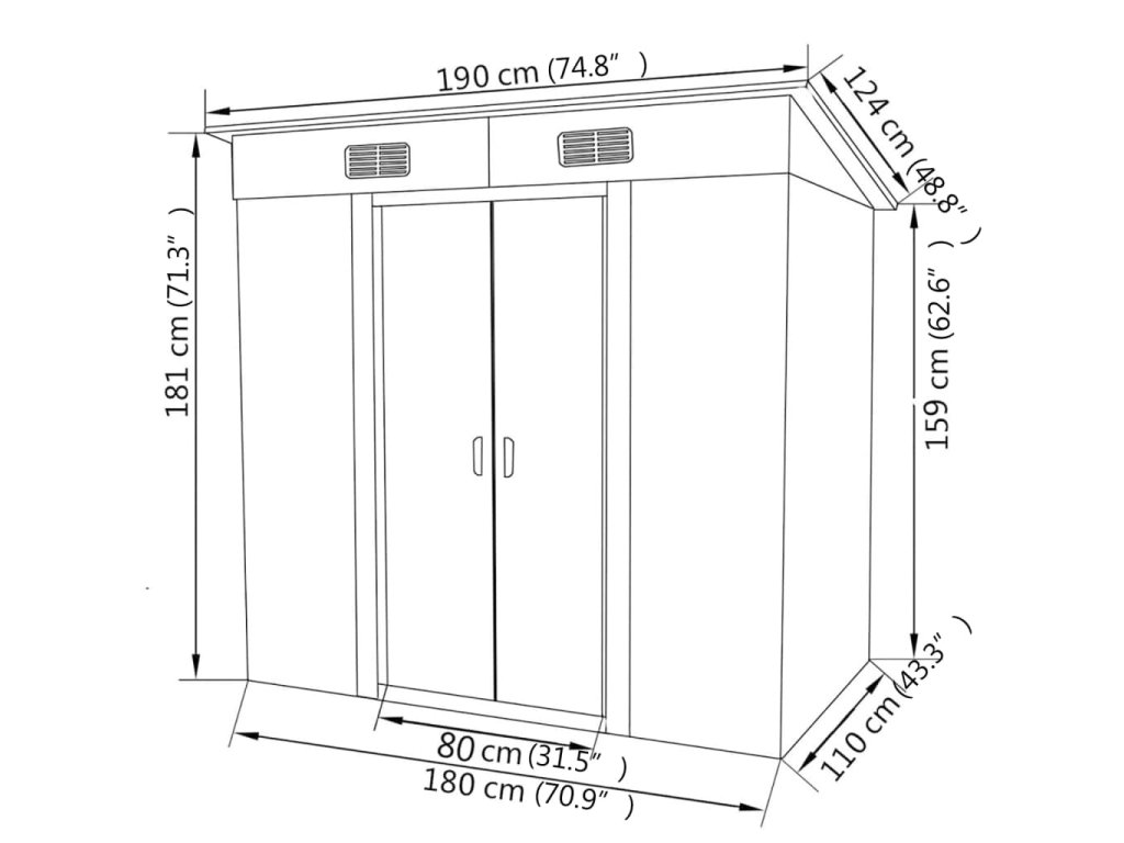 Tento skladovací domček má v prednej časti 2 vetracie otvory, ktoré zabezpečujú vynikajúce vetranie. Dvojité posuvné dvere v prednej časti umožňujú jednoduchý vstup a výstup. Pozinkovaná oceľová konštrukcia spolu s pozinkovaným povrchom ju robí odolnou a pevnou, takže nekoroduje ani ju neovplyvňuje extrémne počasie.