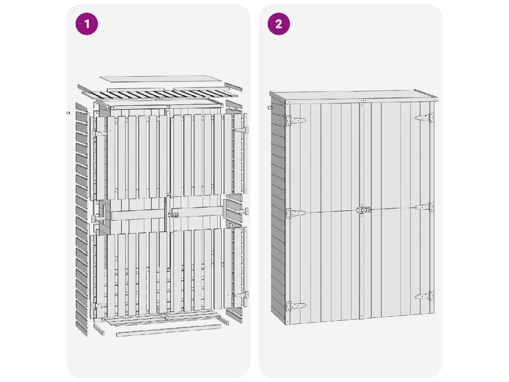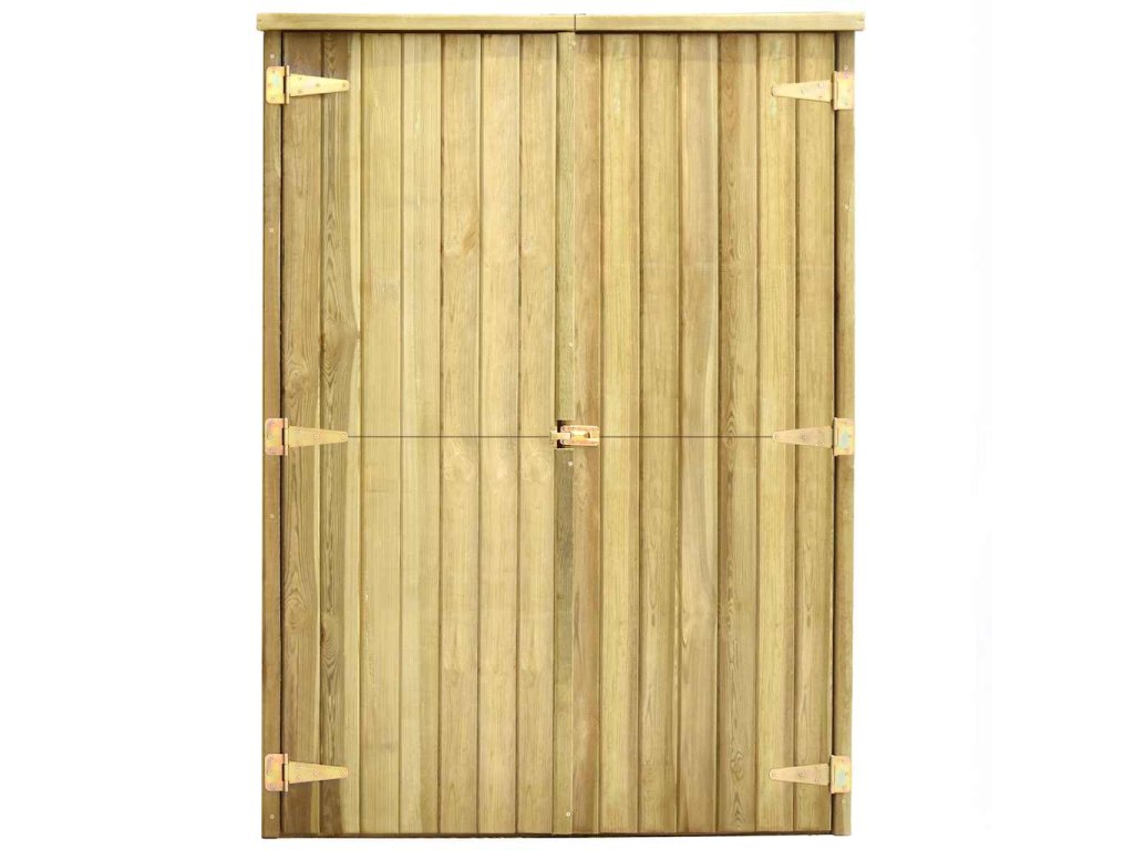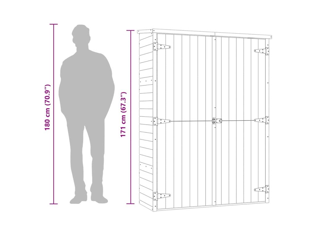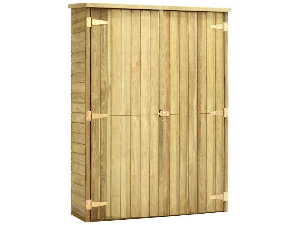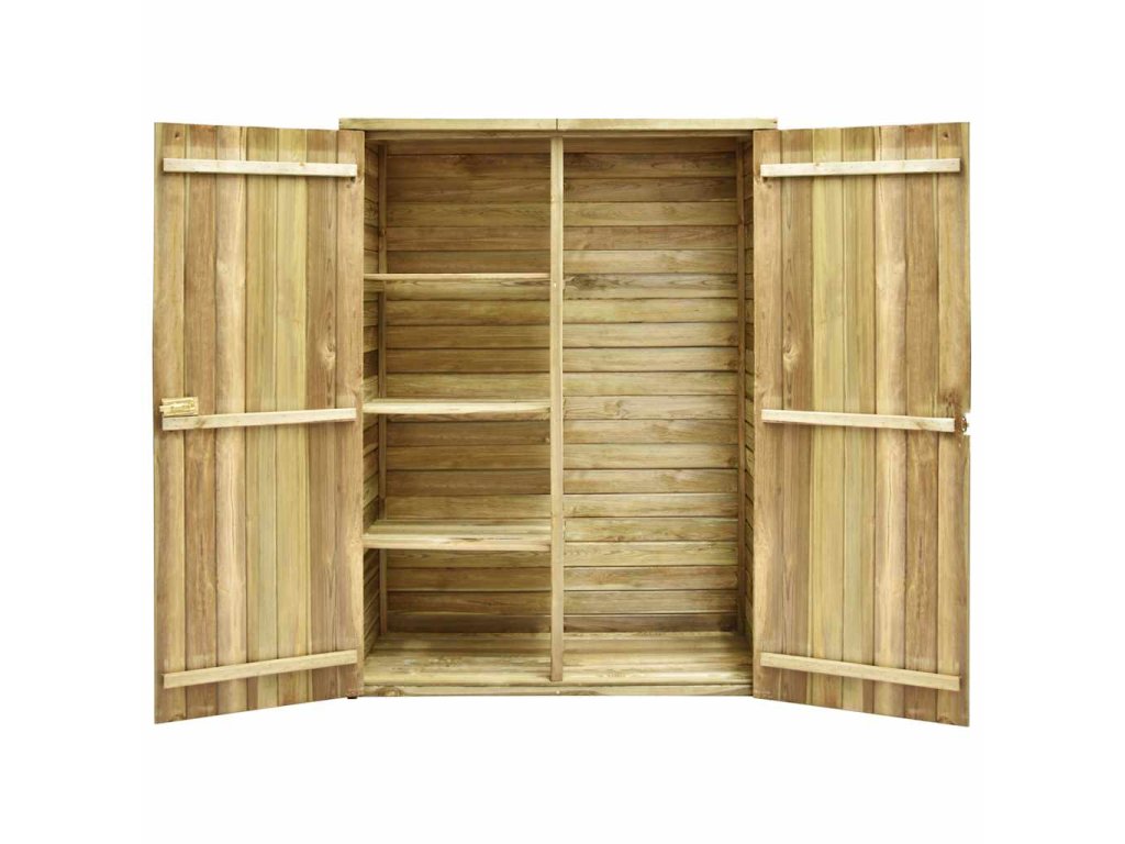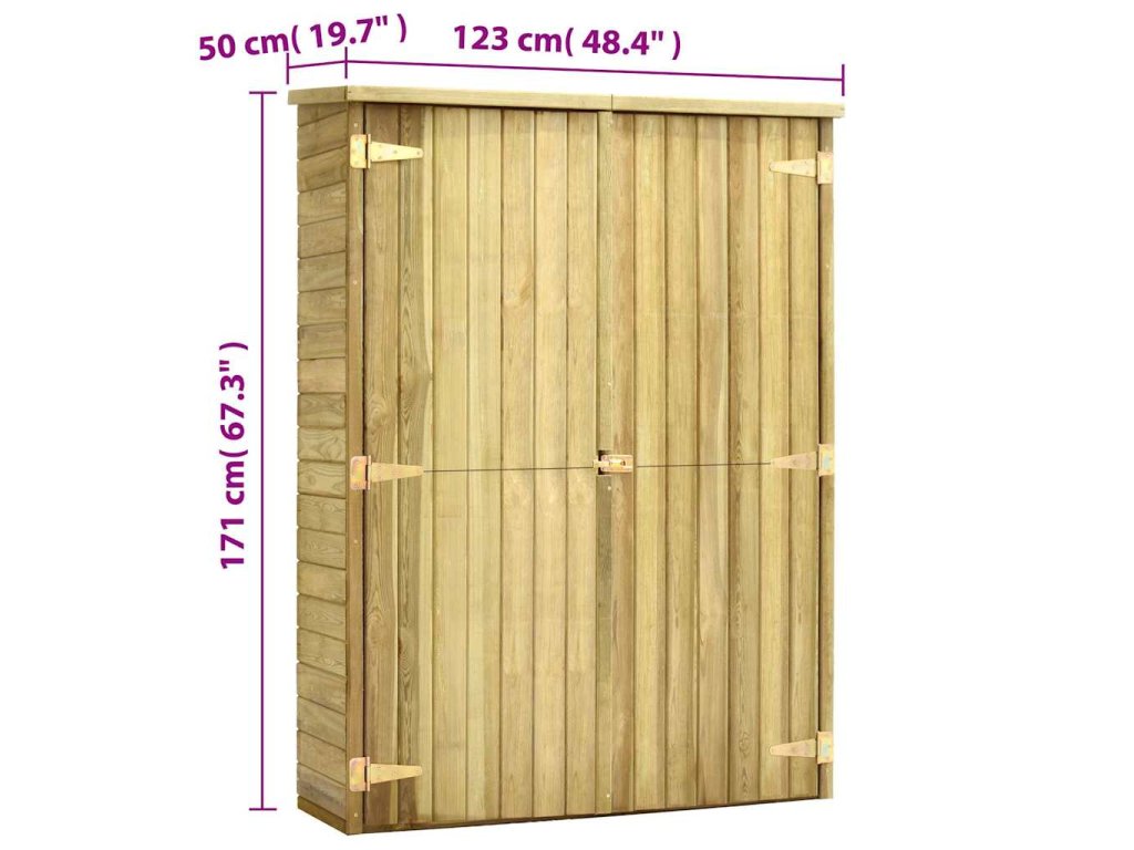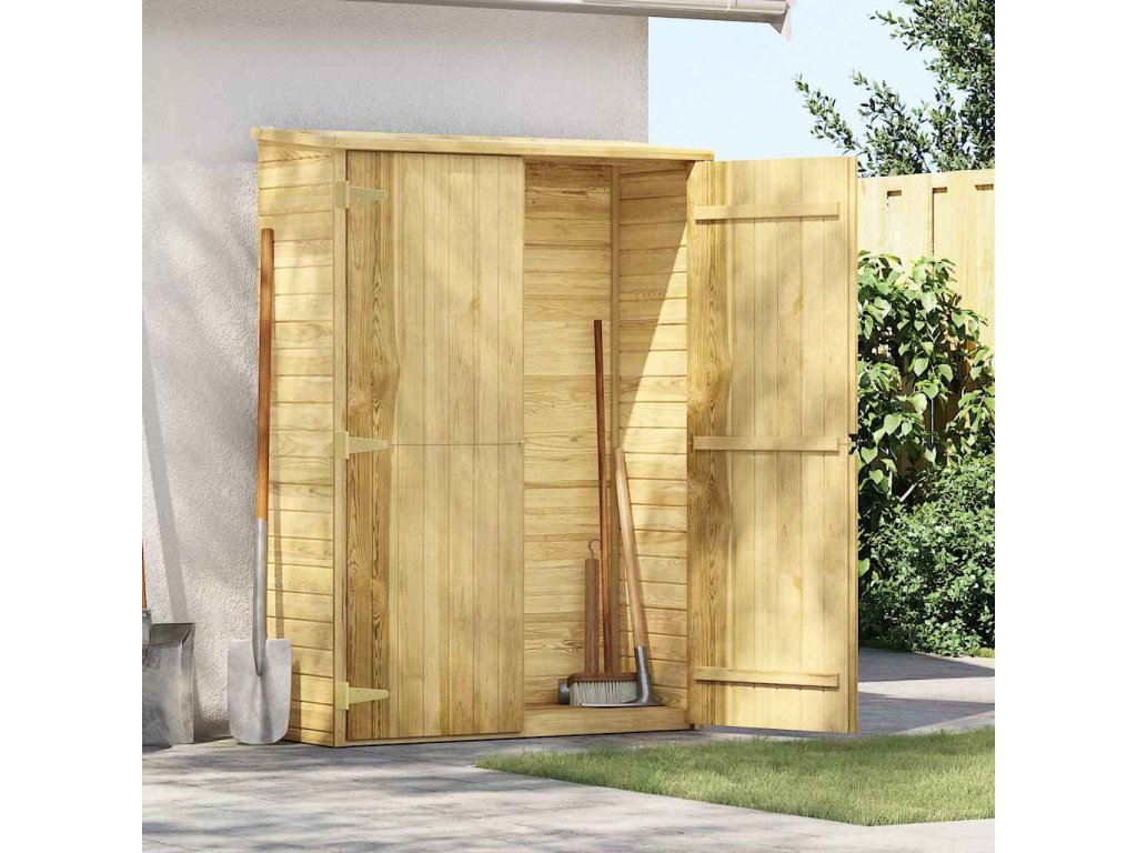 Tento prístrešok je vybavený štyrmi úhľadnými policami a veľkým bočným priestorom a je dokonale navrhnutý pre záhradné náradie, vybavenie na starostlivosť o trávnik, potreby pre bazén, ako aj náradie s dlhými rúčkami ako sú metly, hrable atď. Tento prístrešok vyrobený z kvalitného impregnovaného borovicového dreva je mimoriadne trvácny a odolný voči poveternostným vplyvom. Strecha je pokrytá asfaltovou plsťou, ktorá prístrešok chráni pred vlhkosťou. Dvojité dvere so západkovým dizajnom navyše poskytujú dodatočnú bezpečnosť.