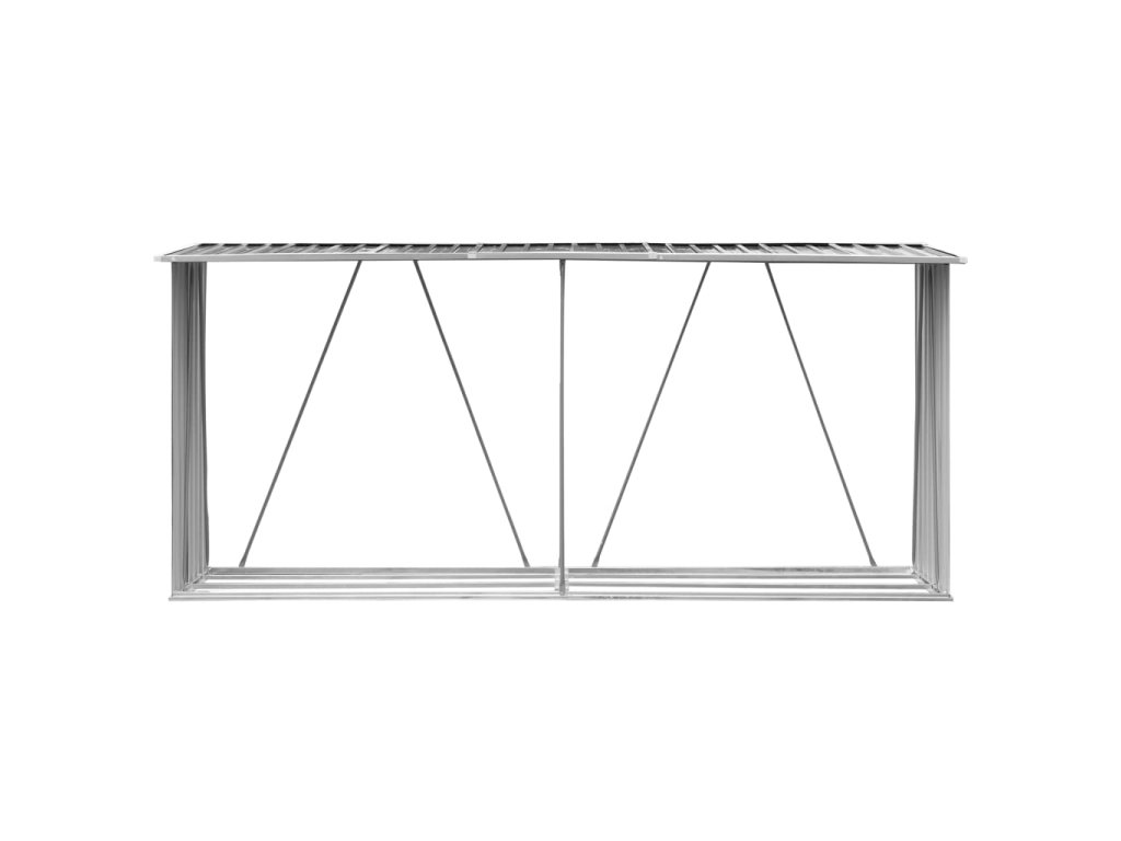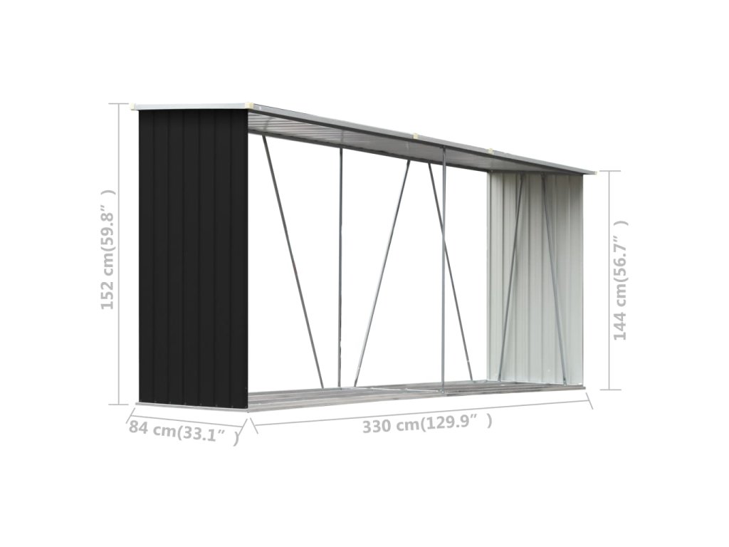 Má stabilnú konštrukciu s oceľovými nosnými tyčami a extra rúrkami na oboch stranách. Keďže je vyrobený z pozinkovanej ocele, sklad na drevo vyžaduje minimálnu údržbu a je veľmi odolný. Tento sklad na drevo obsahuje oceľový podlahový rám pre väčšiu stabilitu a zvýšené podlahové lamely, ktoré udržiavajú drevo vetrané a suché. Dažďová voda bude vďaka šikmej konštrukcii automaticky odtekať zo strechy. Náš sklad na drevo sa ľahko montuje.