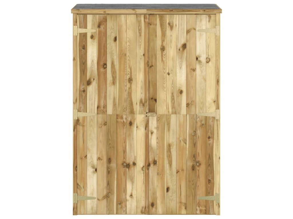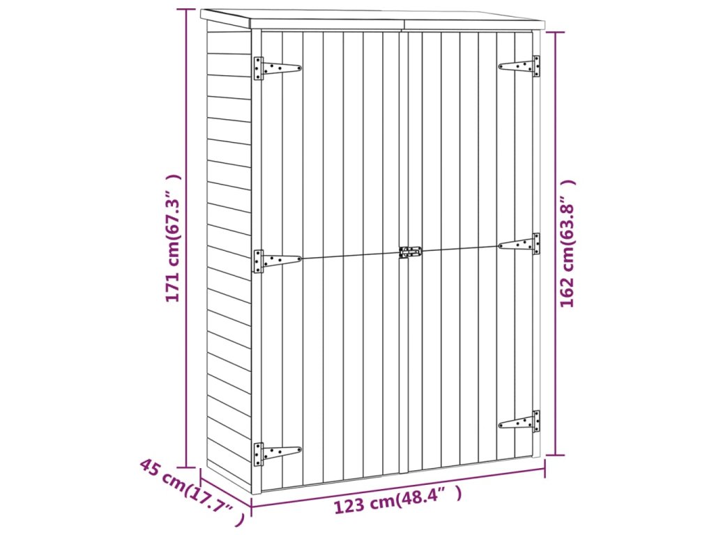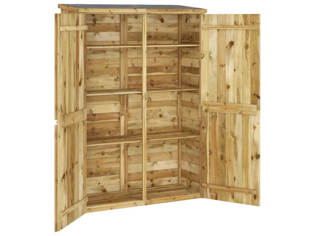 Vonkajší prístrešok je ideálny na uloženie rôznych záhradných nástrojov, zariadení na starostlivosť o trávnik, domácich potrieb a iného záhradného príslušenstva! Tento terasový úložný prístrešok je vyrobený z masívneho impregnovaného dreva, ktoré je pevné, odolné voči korózii a veľmi trvácne. Okrem toho je strecha obložená vodeodolnou bitúmenovou plsťou, aby náradie nepremoklo počas dažďa.