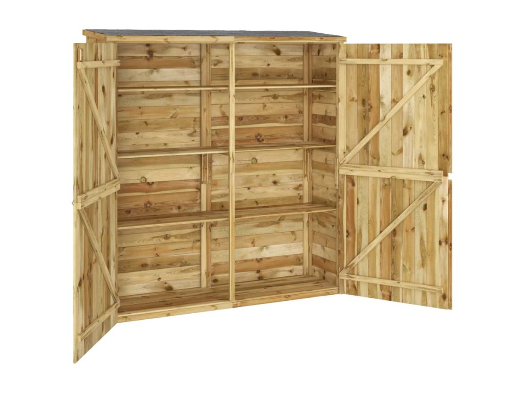 - Veľký a dobre organizovaný priestor: Táto drevená kôlňa má 3 dobre organizované police, ktoré sú ako stvorené na odkladanie záhradného náradia, vybavenia na starostlivosť o trávnik, bazénového príslušenstva a nástrojov s dlhou rukoväťou, ako sú metly, hrable a podobne.