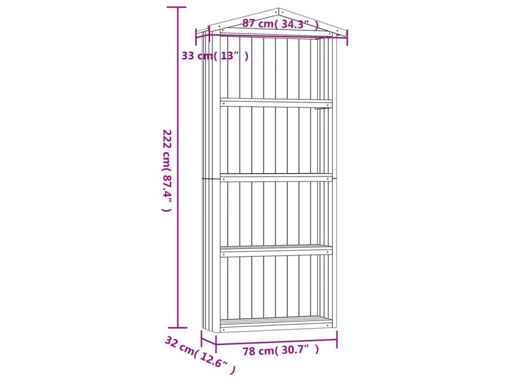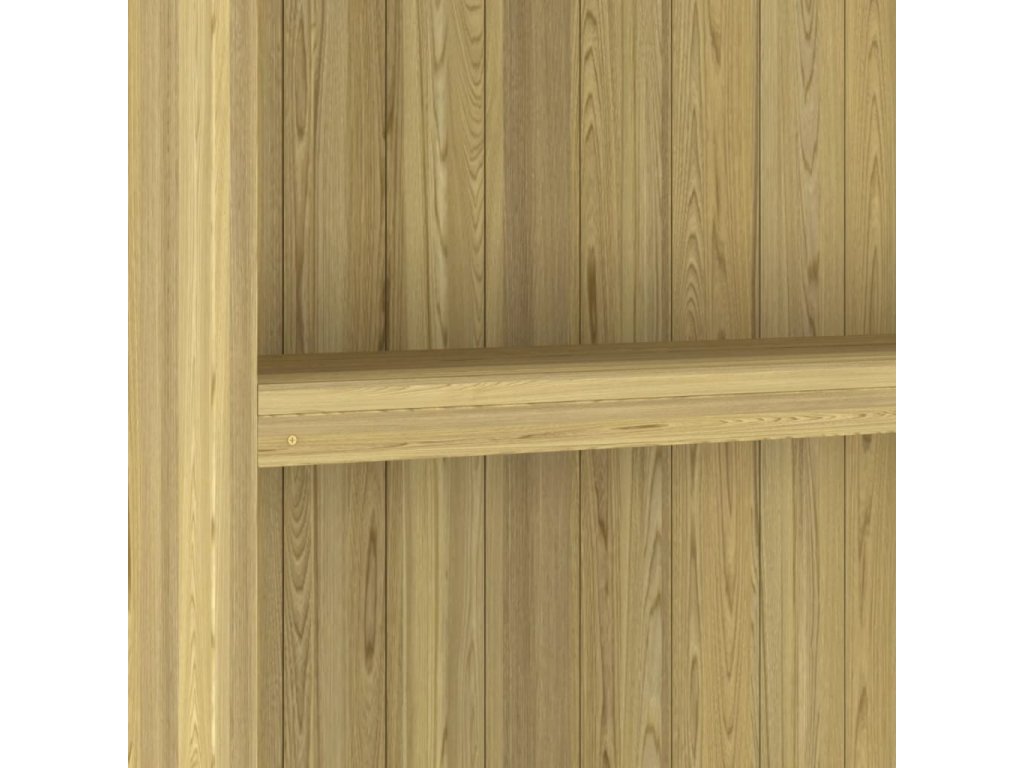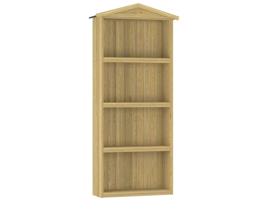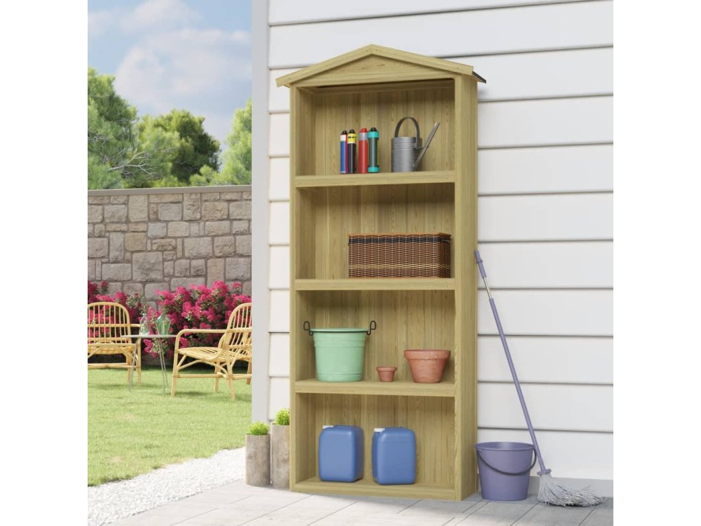 Tento prístrešok je mimoriadne trvácny a odolný voči poveternostným vplyvom, pretože bol vyrobený z kvalitného impregnovaného borovicového dreva. Strecha je pokrytá asfaltovou plsťou, ktorá ho chráni pred vlhkosťou. Prístrešok má 4 veľké otvorené police, kde môžete uložiť krhly, hrable, lopaty alebo iné záhradné náradie, ako aj iné predmety, a udržiavať ich čisté a uložené.