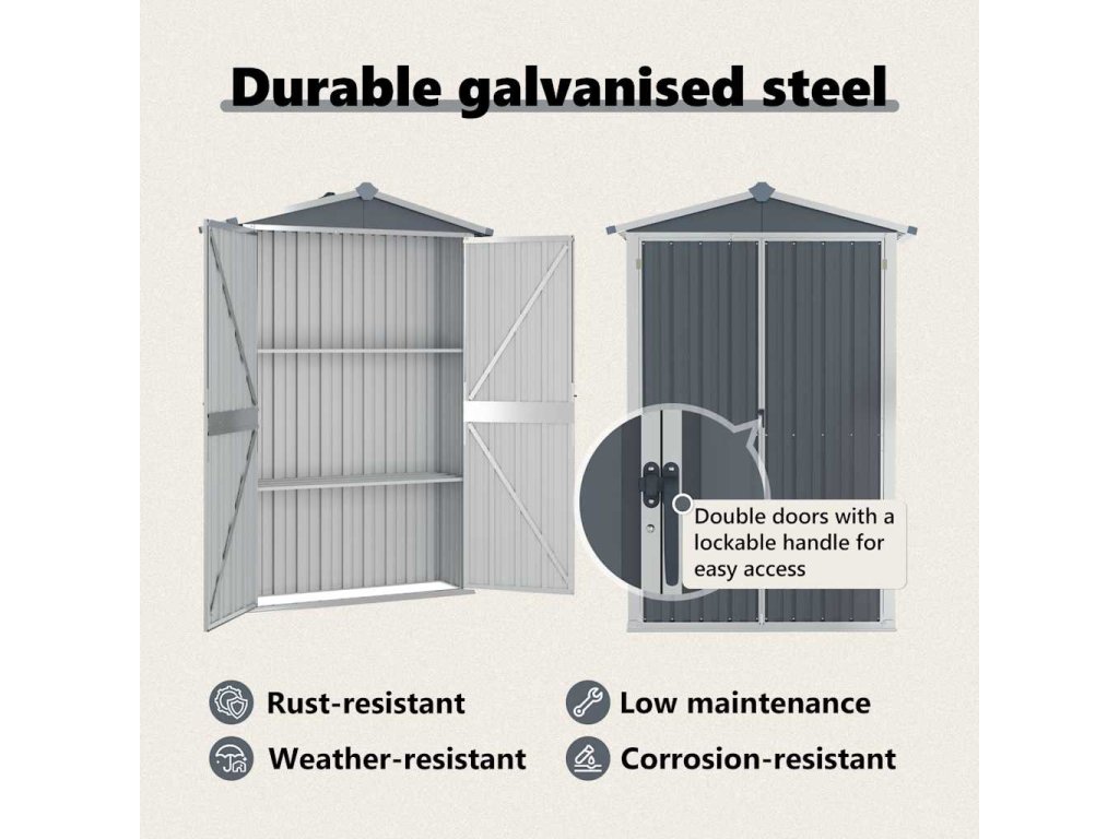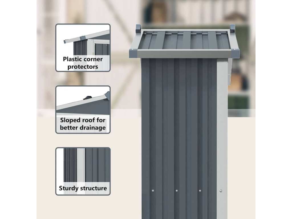 - Stabilný a odolný: Tento vonkajší domček je vyrobený z pozinkovanej ocele, takže vyžaduje minimálnu údržbu a je veľmi odolný. Domček ponúka ochranu pred nečistotami, prachom, silným vetrom a nepriaznivým počasím.