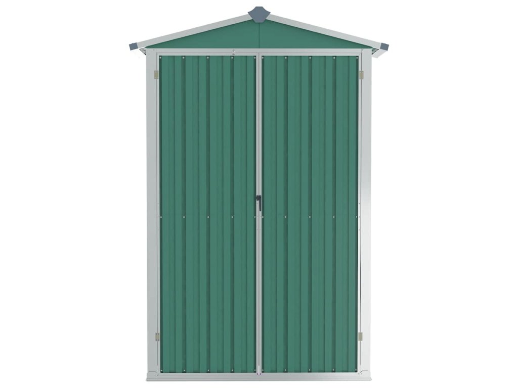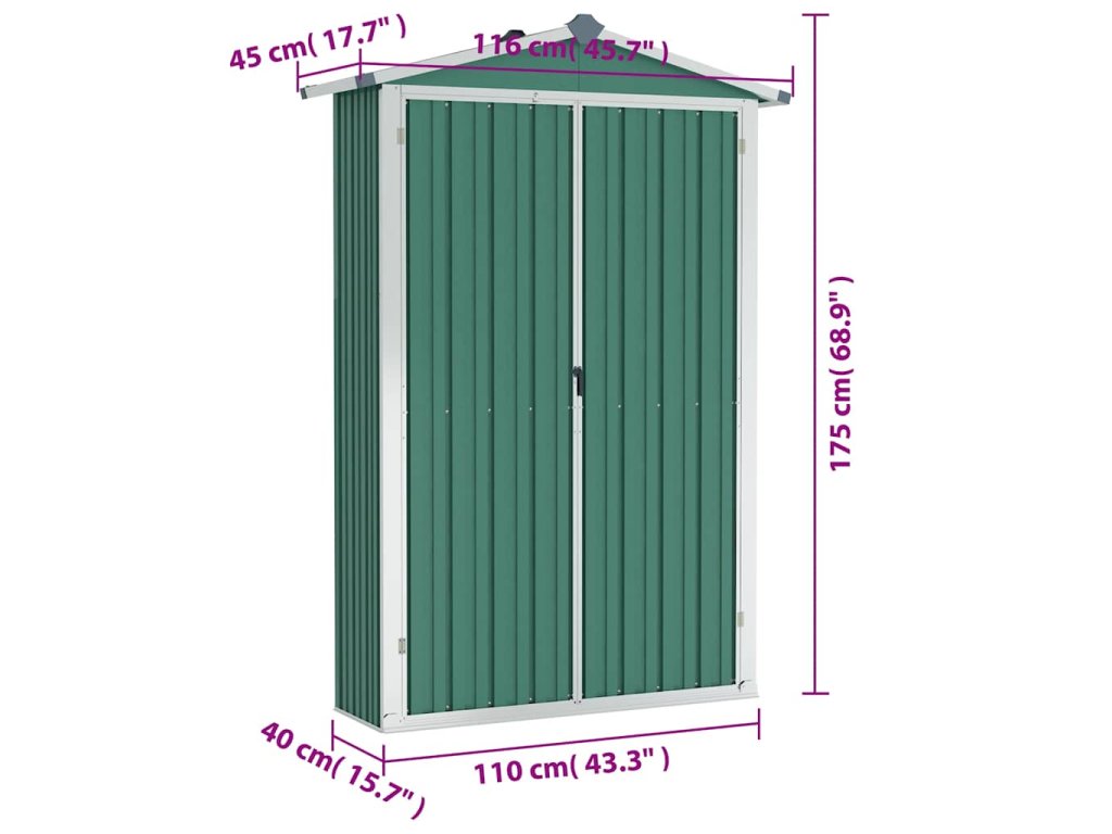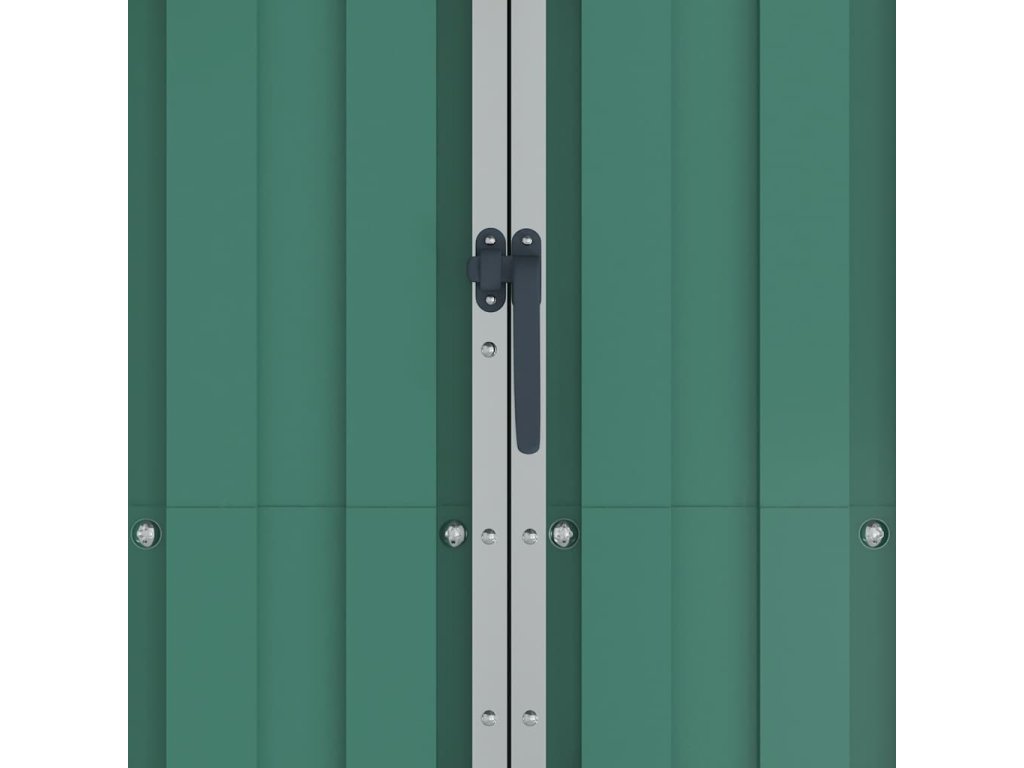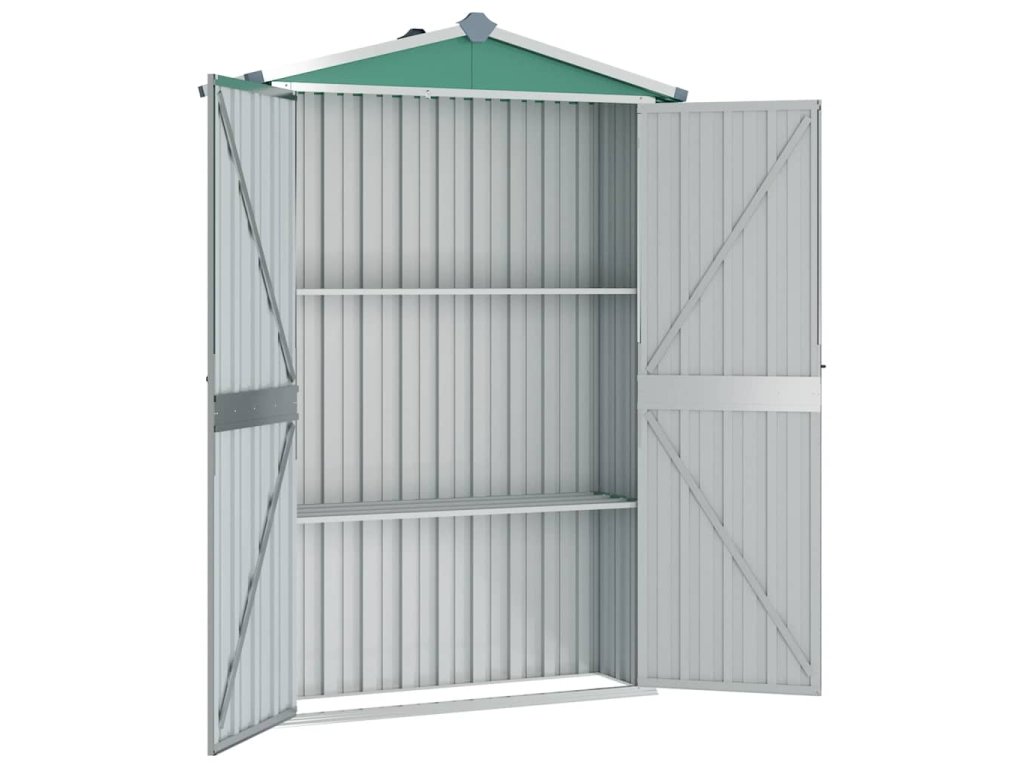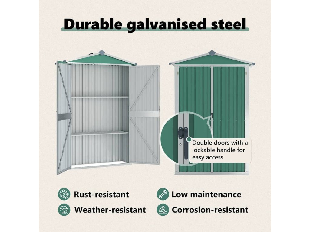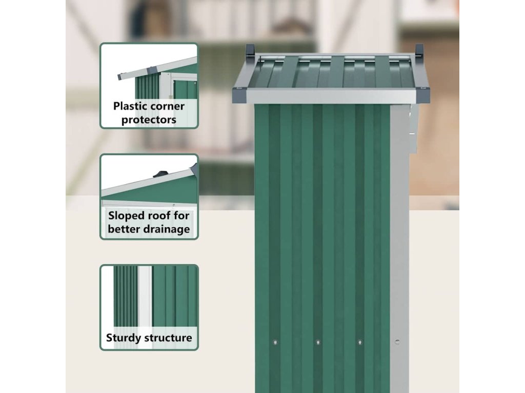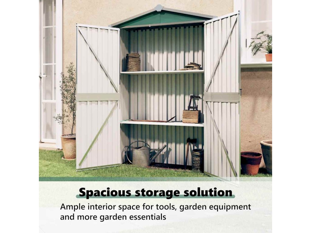 Tento skladovací domček je vybavený vetracími otvormi, ktoré zabezpečujú vetranie a znižujú hromadenie vlhkosti a zápachu v dome. Vďaka policiam ponúka dostatok úložného priestoru na usporiadanie vašich dôležitých vecí. Okrem toho je tento vonkajší skladovací domček vyrobený z pozinkovanej ocele, takže vyžaduje minimálnu údržbu a je veľmi odolný. Dvojité otváracie dvere v prednej časti umožňujú jednoduchý vstup a výstup. Dažďová voda automaticky odteká zo strechy vďaka šikmej konštrukcii.