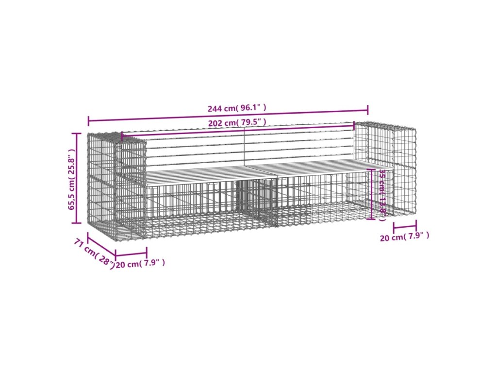 - Pevná a stabilná základňa: Táto vonkajšia lavička má základňu z koša z galvanizovanej ocele. Je navrhnutá tak, aby bola vyplnená kameňmi a štrkom pre dodatočnú krásu. Mriežku tvoria priečne a pozdĺžne drôty, ktoré sú zvarené na každom prieseku pre čo najväčšiu stabilitu.