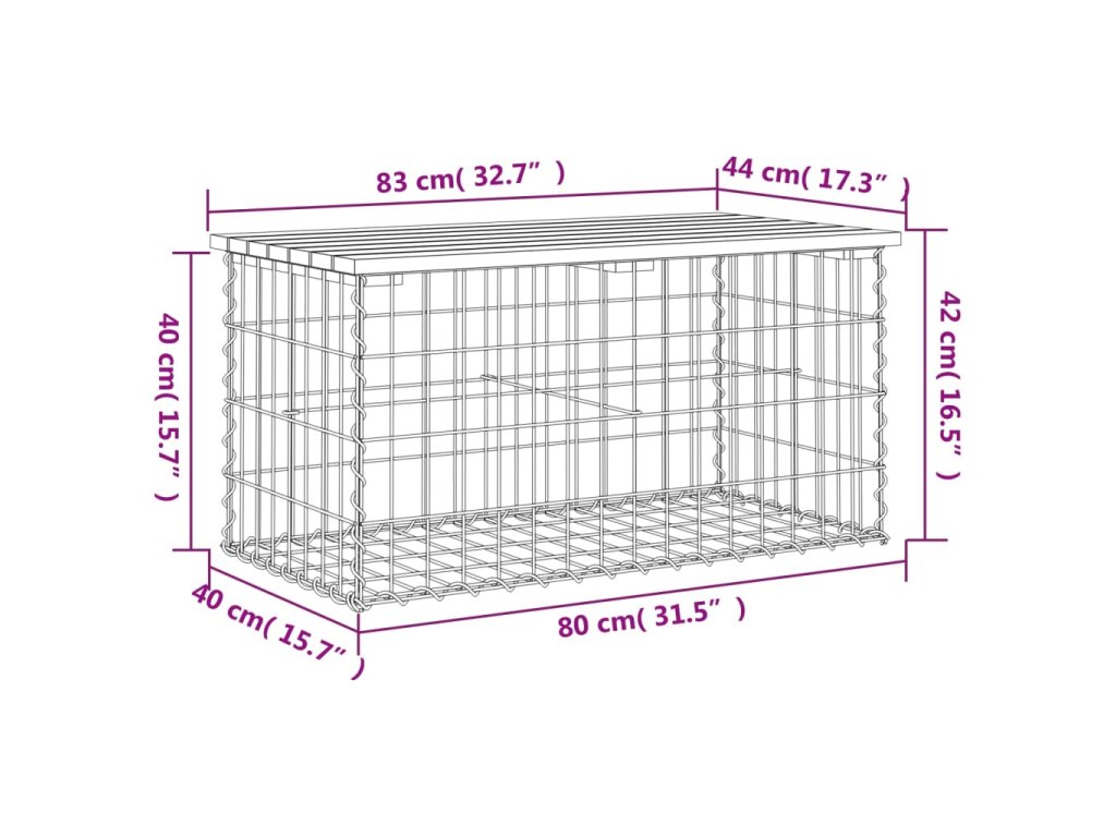 - Pevná a stabilná základňa: Táto vonkajšia lavička má základňu z koša z galvanizovanej ocele. Je navrhnutá tak, aby bola vyplnená kameňmi a štrkom pre dodatočnú krásu. Mriežku tvoria priečne a pozdĺžne drôty, ktoré sú zvarené na každom prieseku pre čo najväčšiu stabilitu.