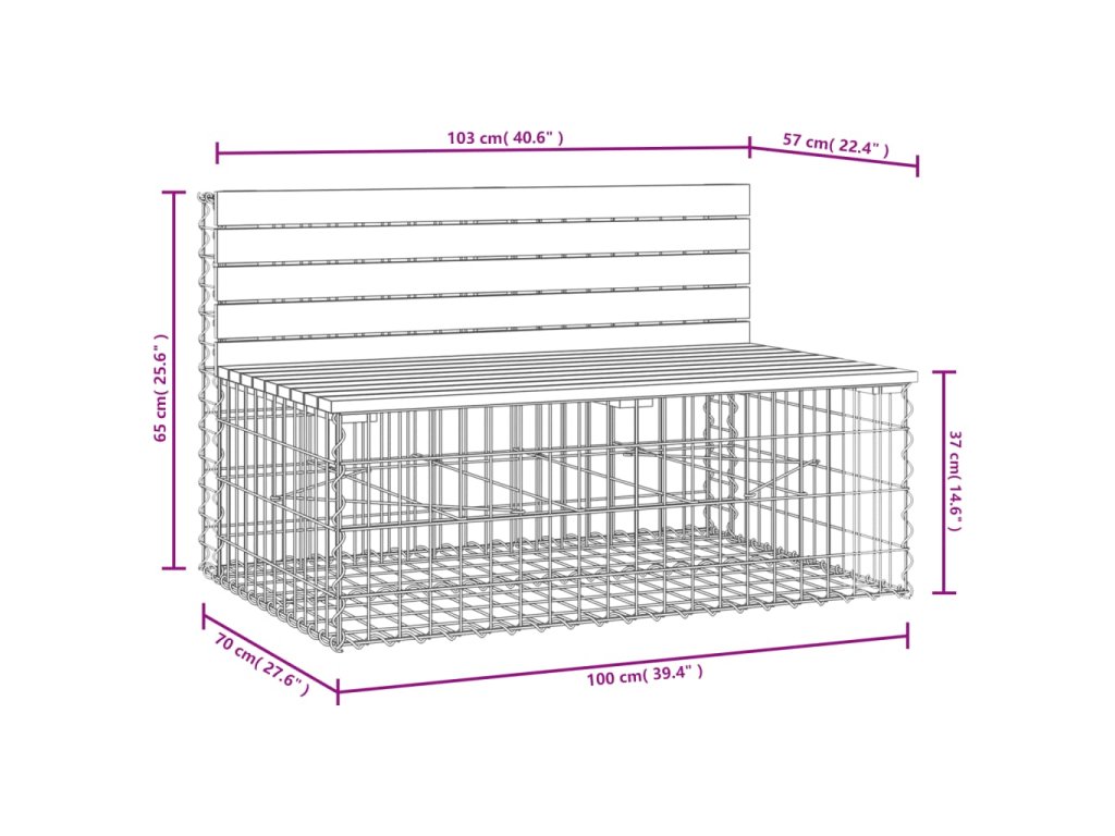 - Pevná a stabilná základňa: Táto vonkajšia lavička má základňu z koša z galvanizovanej ocele. Je navrhnutá tak, aby bola vyplnená kameňmi a štrkom pre dodatočnú krásu. Mriežku tvoria priečne a pozdĺžne drôty, ktoré sú zvarené na každom prieseku pre čo najväčšiu stabilitu.