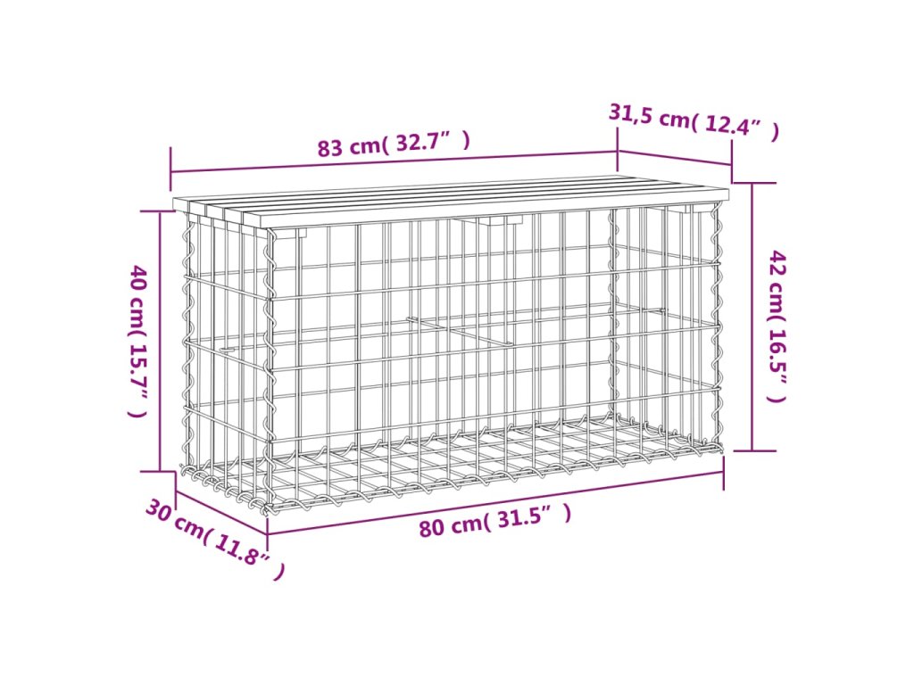 - Pevná a stabilná základňa: Táto vonkajšia lavička má základňu z koša z galvanizovanej ocele. Je navrhnutá tak, aby bola vyplnená kameňmi a štrkom pre dodatočnú krásu. Mriežku tvoria priečne a pozdĺžne drôty, ktoré sú zvarené na každom prieseku pre čo najväčšiu stabilitu.