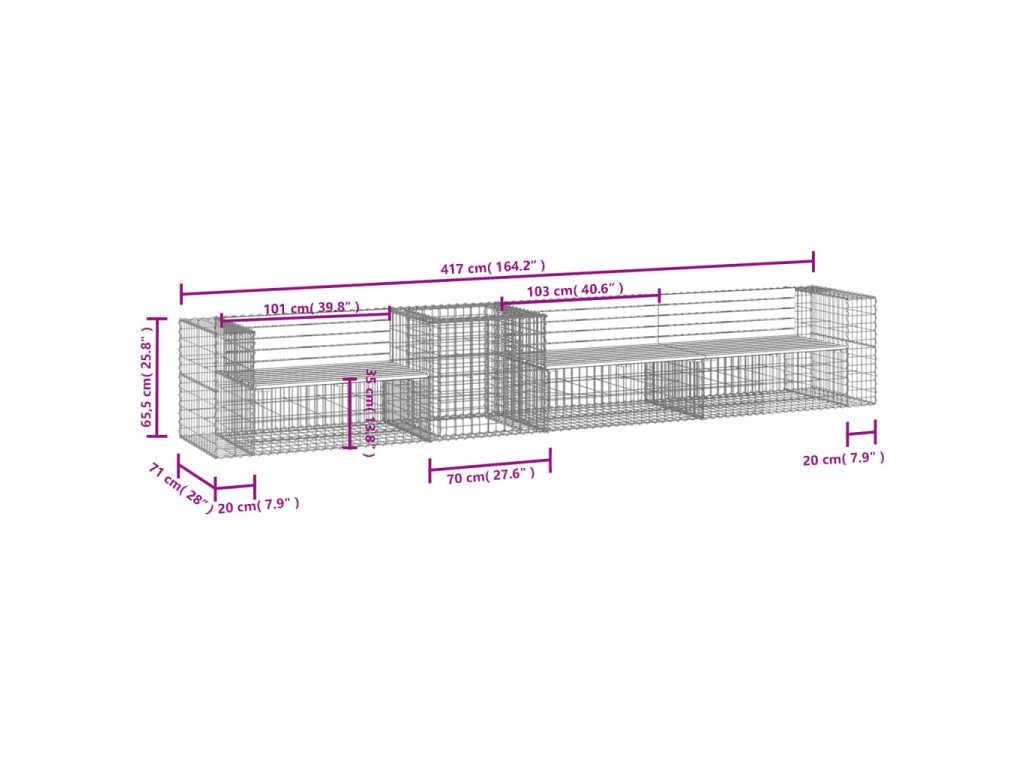 - Pevná a stabilná základňa: Táto vonkajšia lavička má základňu z koša z galvanizovanej ocele. Je navrhnutá tak, aby bola vyplnená kameňmi a štrkom pre dodatočnú krásu. Mriežku tvoria priečne a pozdĺžne drôty, ktoré sú zvarené na každom prieseku pre čo najväčšiu stabilitu.