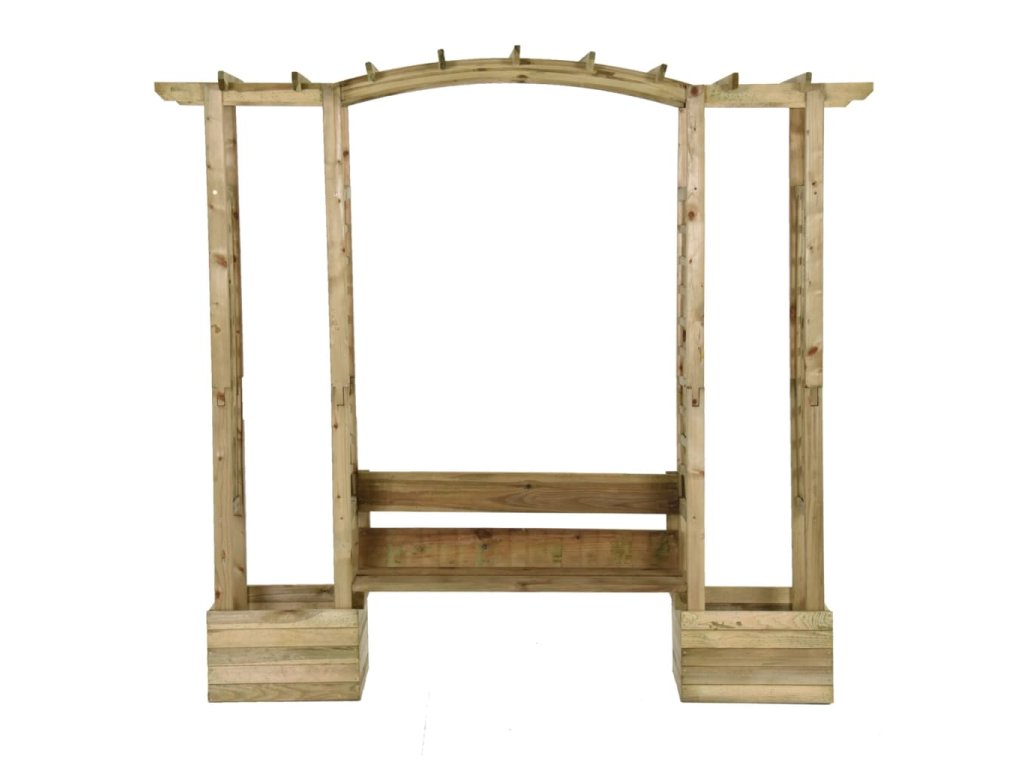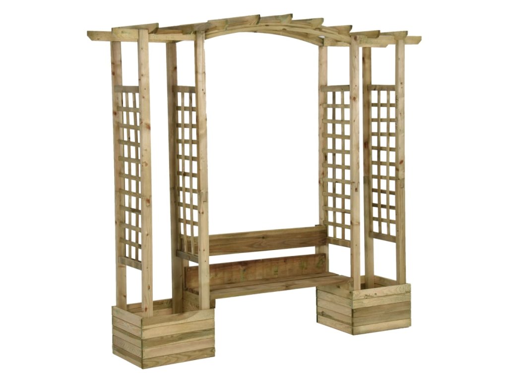 - Multifunkčný záhradný oblúk: Pergola obsahuje lavicu s dvoma kvetináčmi na ruže a iné popínavé rastliny. Je to miesto, kde si môžete oddýchnuť a načerpať sily. Len si predstavte, aké by to bolo úžasné, keď bude posiata kvetmi!