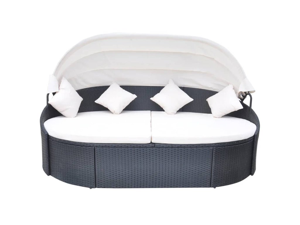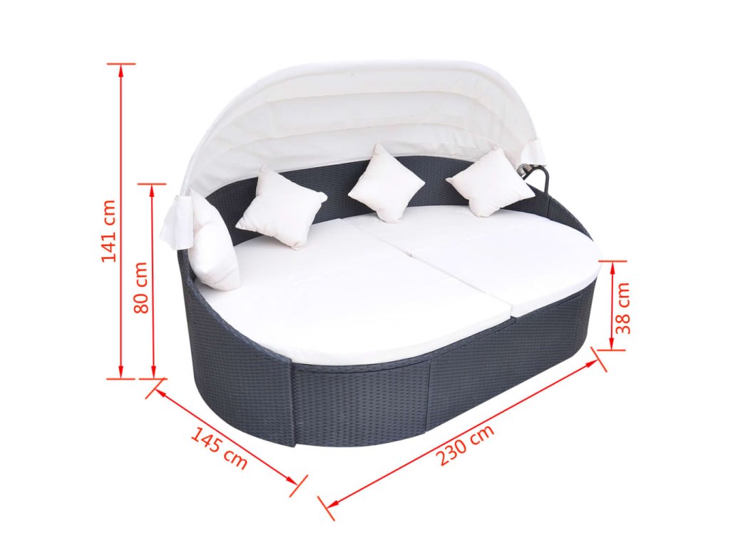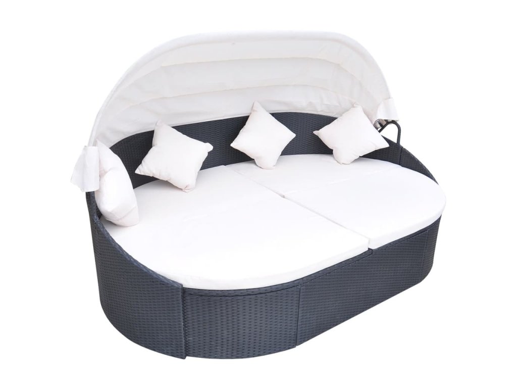 - V balení sa nachádza: 1 x oválne ratanové ležadlo s baldachýnom, 4 x vankúš, 2 x podložka na sedadlo